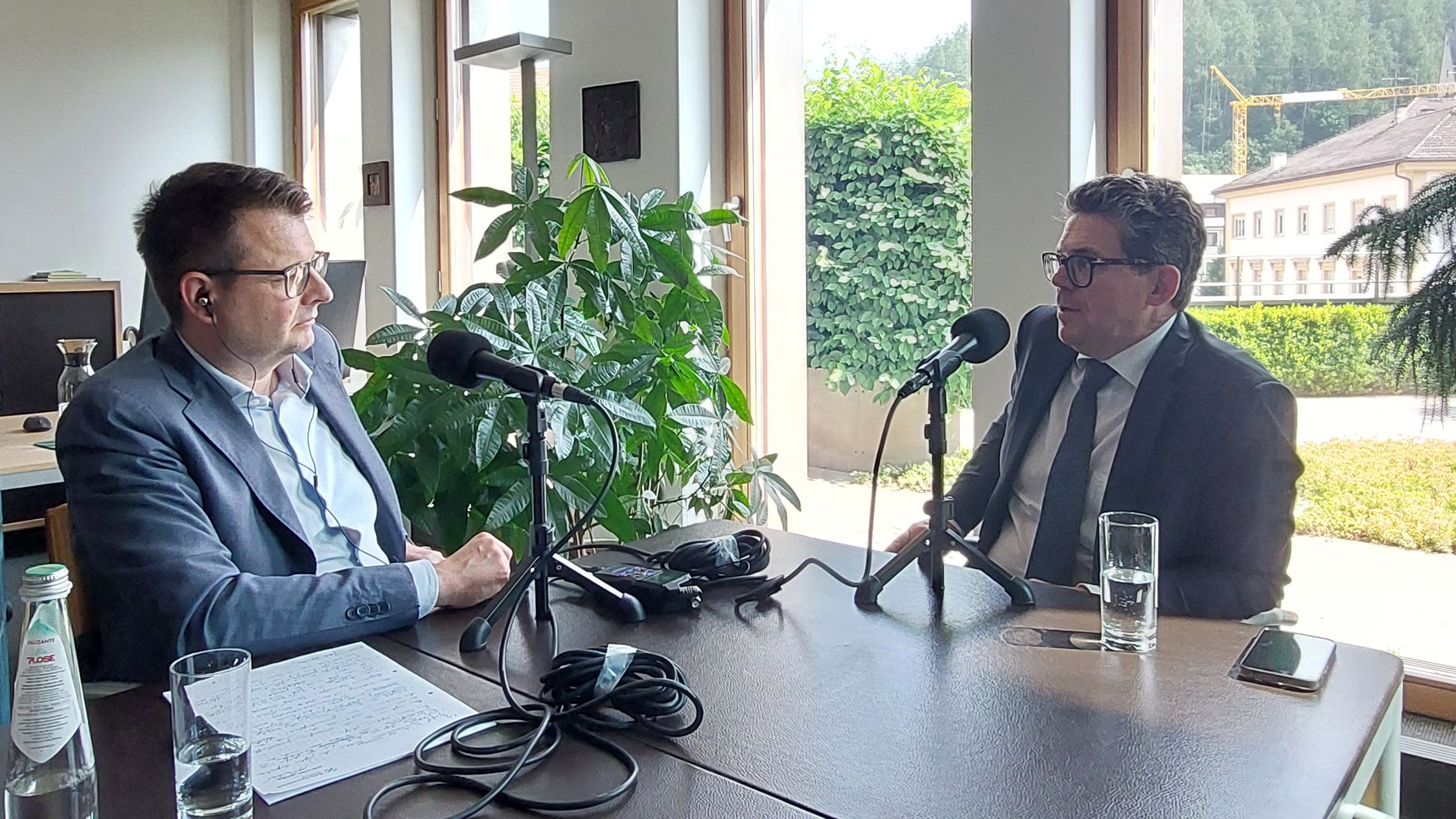 Im Podcast nah.dran.ge(h)n Georg Oberhollenzer, Direktor der Raiffeisenkasse Bruneck mit dem Podcast-Host Florian Pedron, Bereichleiter Strategie & Mitgliederbetreuung.