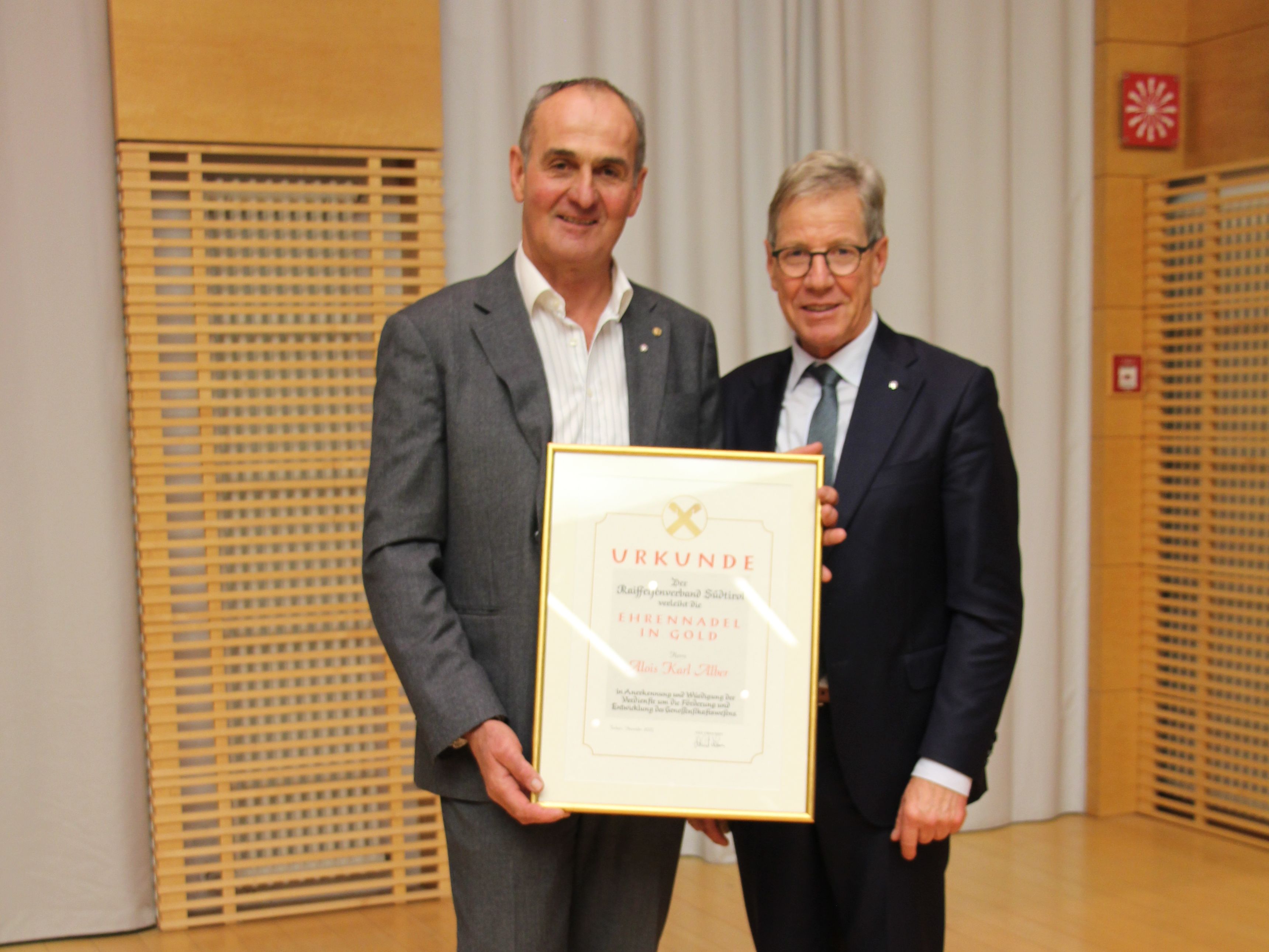 Im Rahmen der Jahresvollversammlung der Obstgenossenschaft Juval am 20. November 2025 wurde Obmann Alois Karl Alber für sein Wirken im Genossenschaftswesen geehrt. Verbandsobmann Herbert Von Leon überreichte ihm die Raiffeisen-Ehrennadel in Gold und würdigte in einer Laudatio seine jahrzehntelangen Verdienste. Auch Peter Stricker, ehemaliger und langjähriger Geschäftsführer der OG Juval, hob im Namen der Genossenschaft die prägende Rolle Albers hervor.
