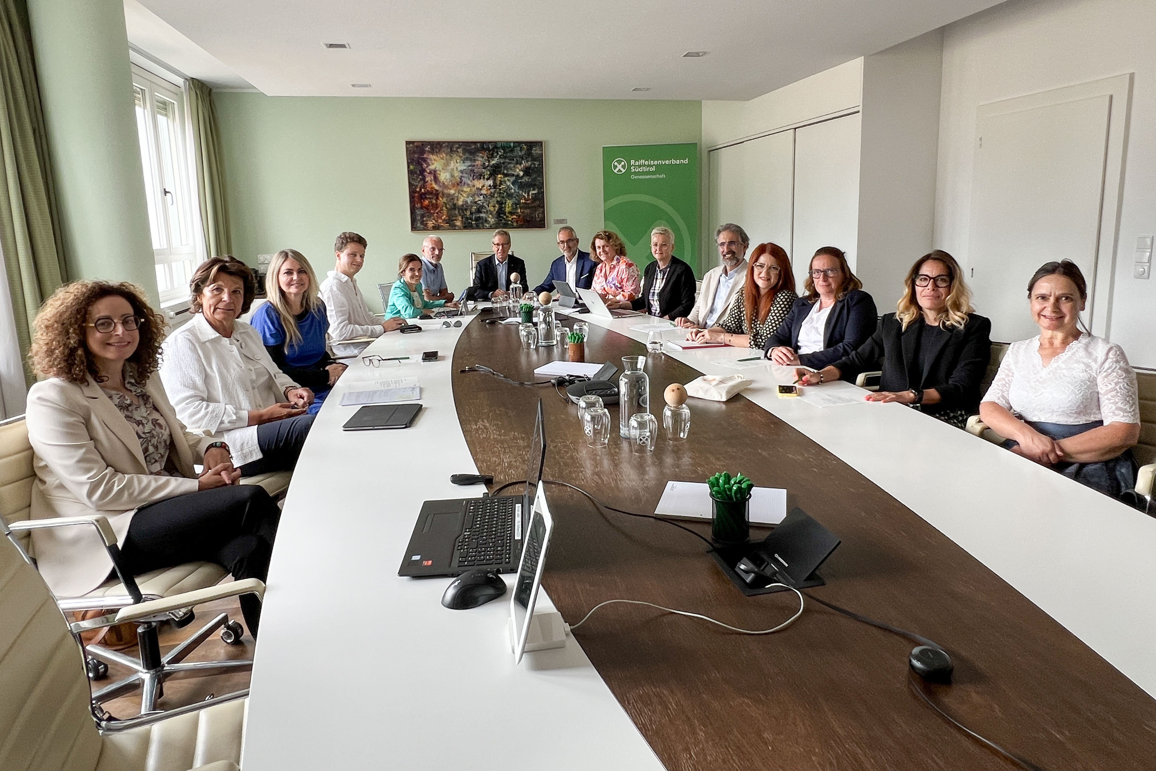 Der Obmann des Raiffeisenverbandes Obmann Herbert Von Leon begrüßte die anwesenden Vertreter*innen der Sozialgenossenschaften, die LR Rosmarie Pamer und ihre Ressortleiterin Michela Morandini zum Austausch über die aktuellen Herausforderungen im sozialen Bereich. Im Rahmen des Treffens ging es vor allem um die Neuerungen im Kollektivvertrag der Seniorenwohnheime sowie die Sicherung qualifizierter Fachkräfte im Sozialbereich. Die Teilnehmenden diskutierten weiters über konkrete Maßnahmen zur finanziellen Unterstützung und zur Verbesserung der Rahmenbedingungen.