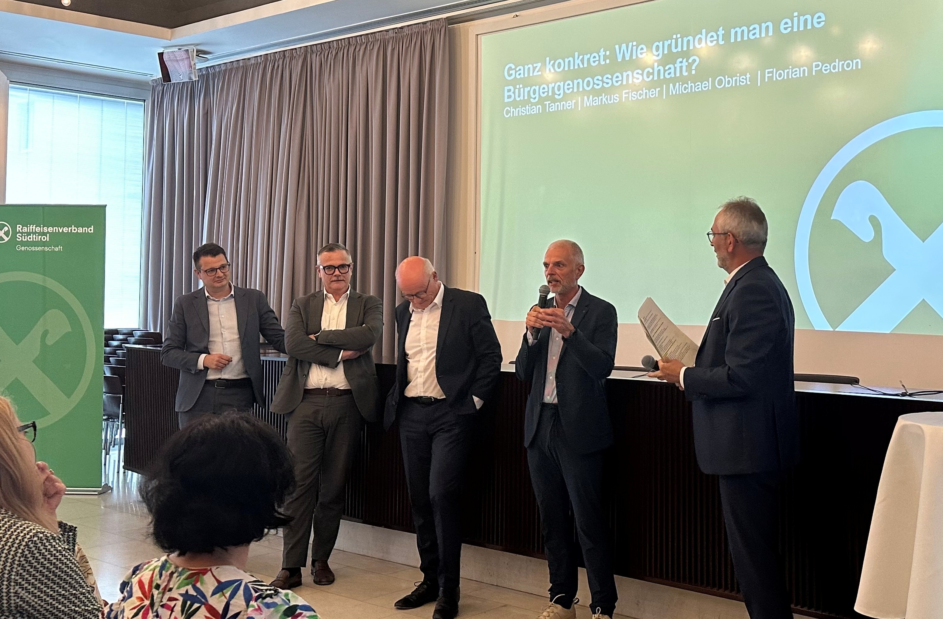 Der Raiffeisenverband Südtirol begleitet interessierte Personen auf dem Weg zur Gründung einer Bürgergenossenschaft. Die Fachleute des Verbandes rund um Christian Tanner (Vizedirektor und Leiter Bereich Soziales & Bildung), Markus Fischer (Leiter Bereich Steuern & Buchhaltungsservice), Michael Obrist (Leiter Bereich Recht) und Florian Pedron (Leiter Bereich Strategie & Mitgliederbetreuung) verfügen über fundiertes Wissen hinsichtlich möglicher Gründungswege, der einschlägigen rechtlichen Rahmenbedingungen sowie strategischer Entwicklungsmöglichkeiten. Wer eine Idee hat, kann sich an die Start-up-Betreuung des Verbandes wenden. Dort werden die Voraussetzungen geprüft und gemeinsam ein langfristig tragfähiges Geschäftsmodell entwickelt: startup(at)raiffeisenverband.it
