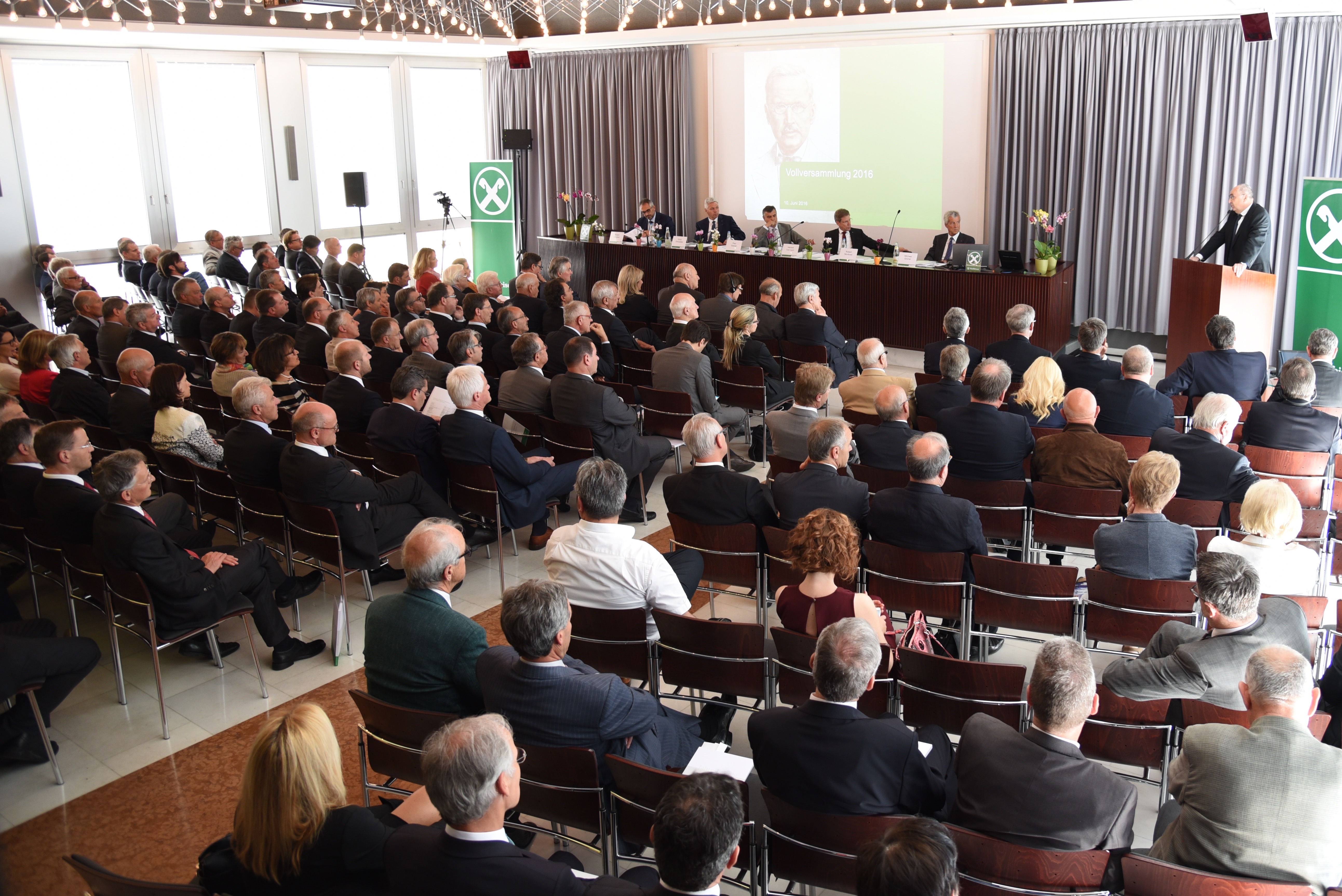 Der Pavillon im Raiffeisenhaus Bozen war bis auf den letzten Platz ausgebucht. Neben den Obleuten der 362 Mitgliedsgenossenschaften waren auch zahlreiche Vertreter aus Politik und Wirtschaft zur diesjährigen Vollversammlung nach Bozen gekommen.