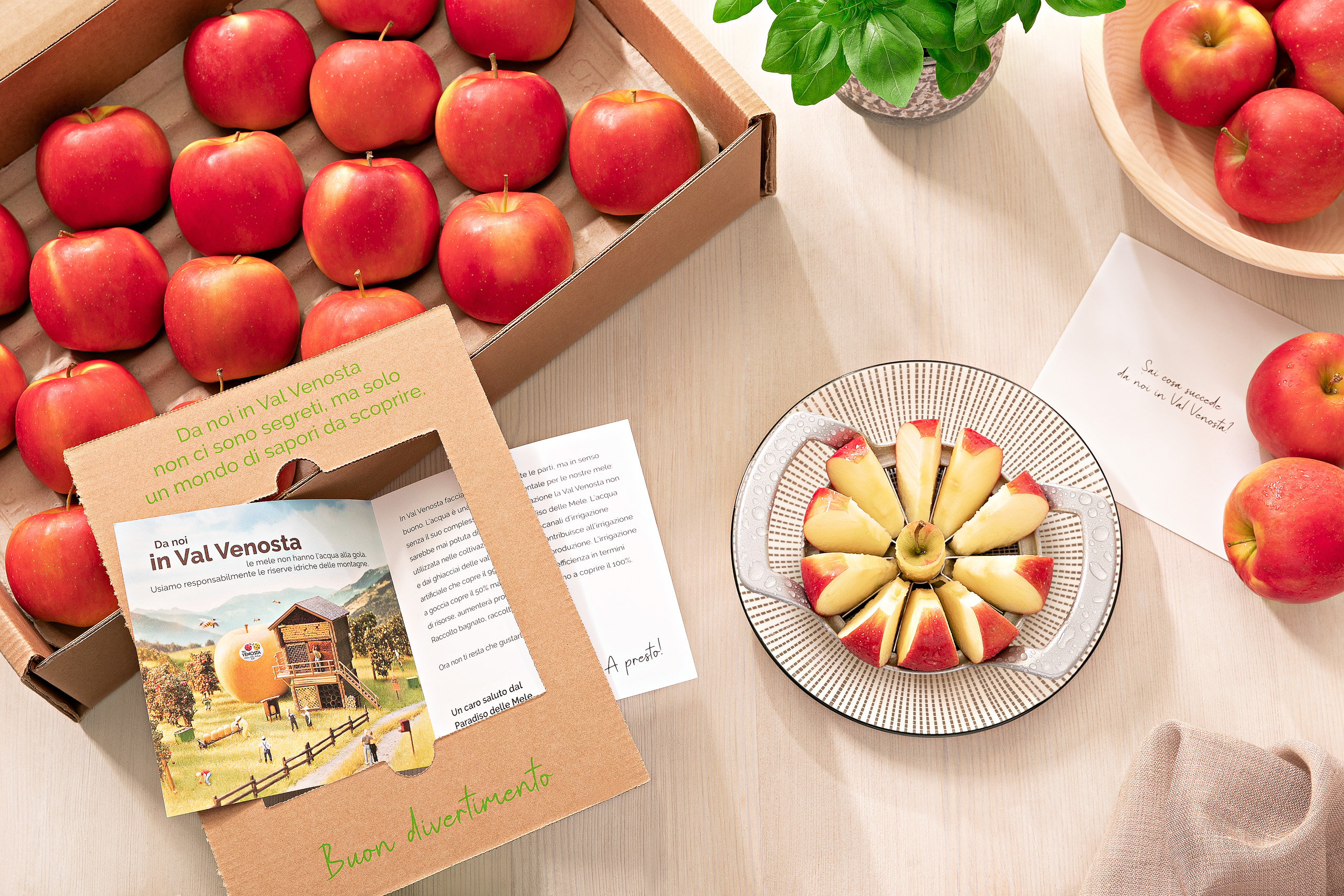 Ob Wein oder Praline: Zahlreiche Lebens- und Genussmittel haben sich längst schon als beliebtes kulinarisches Geschenk oder Mitbringsel etabliert. Warum nicht auch den Apfel als Geschenkidee positionieren? Insbesondere in Zeiten, wo gesunde Ernährung und bewusstes Genießen im Vordergrund steht. Die Apfelbox, in welcher die Äpfel aus dem Vinschgau verschickt werden, macht jedenfalls auch als Geschenkverpackung eine ausgezeichnete Figur: Diese enthält neben den sorgsam verpackten und qualitativ hochwertigen Äpfeln ansprechend gestaltete Infomaterialien, welche die sensorischen Eigenschaften der jeweiligen Apfelsorte beschreiben. Diese tragen dazu bei, den Apfel viel bewusster und unter neuen Gesichtspunkten zu genießen.