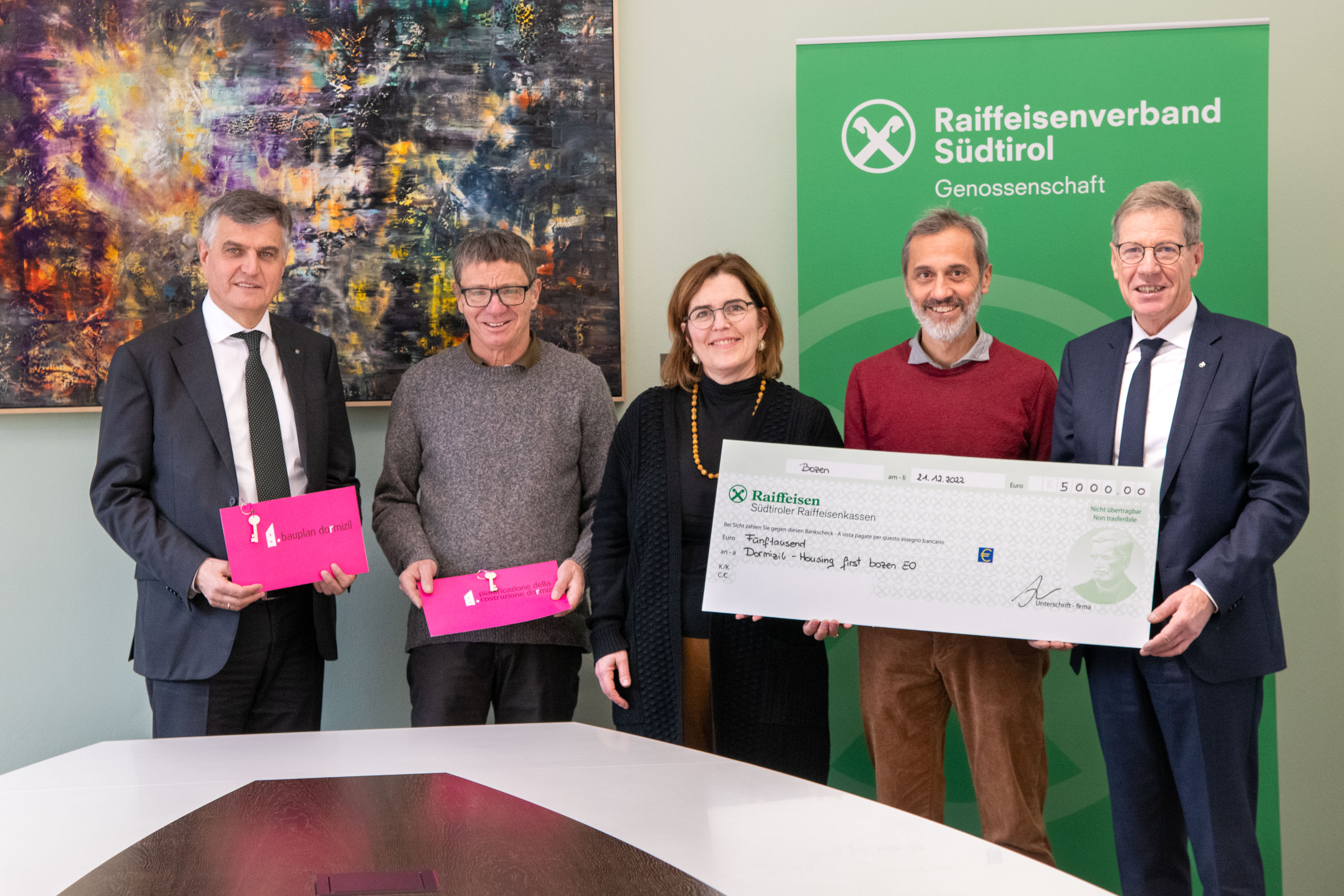 Der Verein führt in Bozen das „Dormizil“, ein Nachtquartier für obdachlose Frauen und Männer in Bozen. Die Unterkunft ist von Oktober bis April geöffnet und stellt 25 Menschen einen Platz zum Schlafen und ein Frühstück bereit. Das Nachtquartier wird ausschließlich von Freiwilligen geführt. „Wir möchten mit dieser Spende einen kleinen Beitrag für die wichtige Arbeit des Vereins leisten und unsere Wertschätzung dafür ausdrücken“, sagte Herbert Von Leon, Obmann des Raiffeisenverbandes, bei der Spendenübergabe. Magdalena Amonn, Vorsitzende des Vereins „Dormizil - Housing first bozen EO“, bedankte sich für die großzügige Unterstützung.
