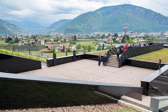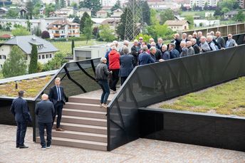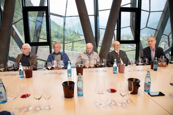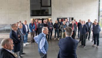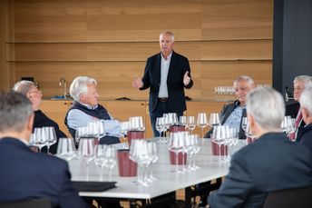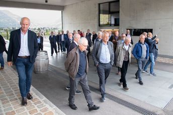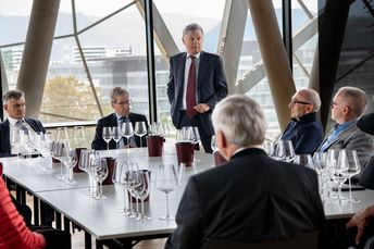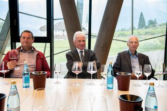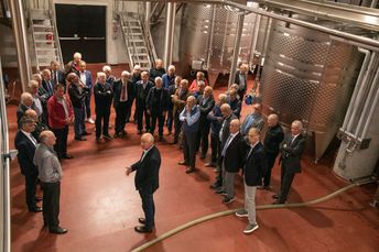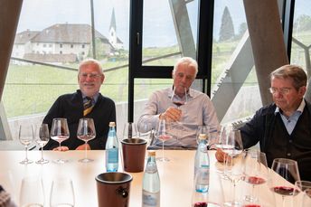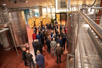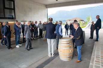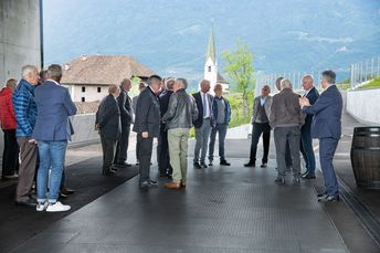 Mit großem Interesse folgten die Teilnehmer den Ausführungen von Michael Bradlwarter, Obmann der Kellerei Bozen. Er führte die Teilnehmer durch das 2018 eröffnete neue Kellereigebäude und verwies dabei auf die architektonischen Besonderheiten und erklärte anschaulich die Abläufe in der Weinproduktion, von der Anlieferung der Trauben bis zum Verkauf des Weines.
