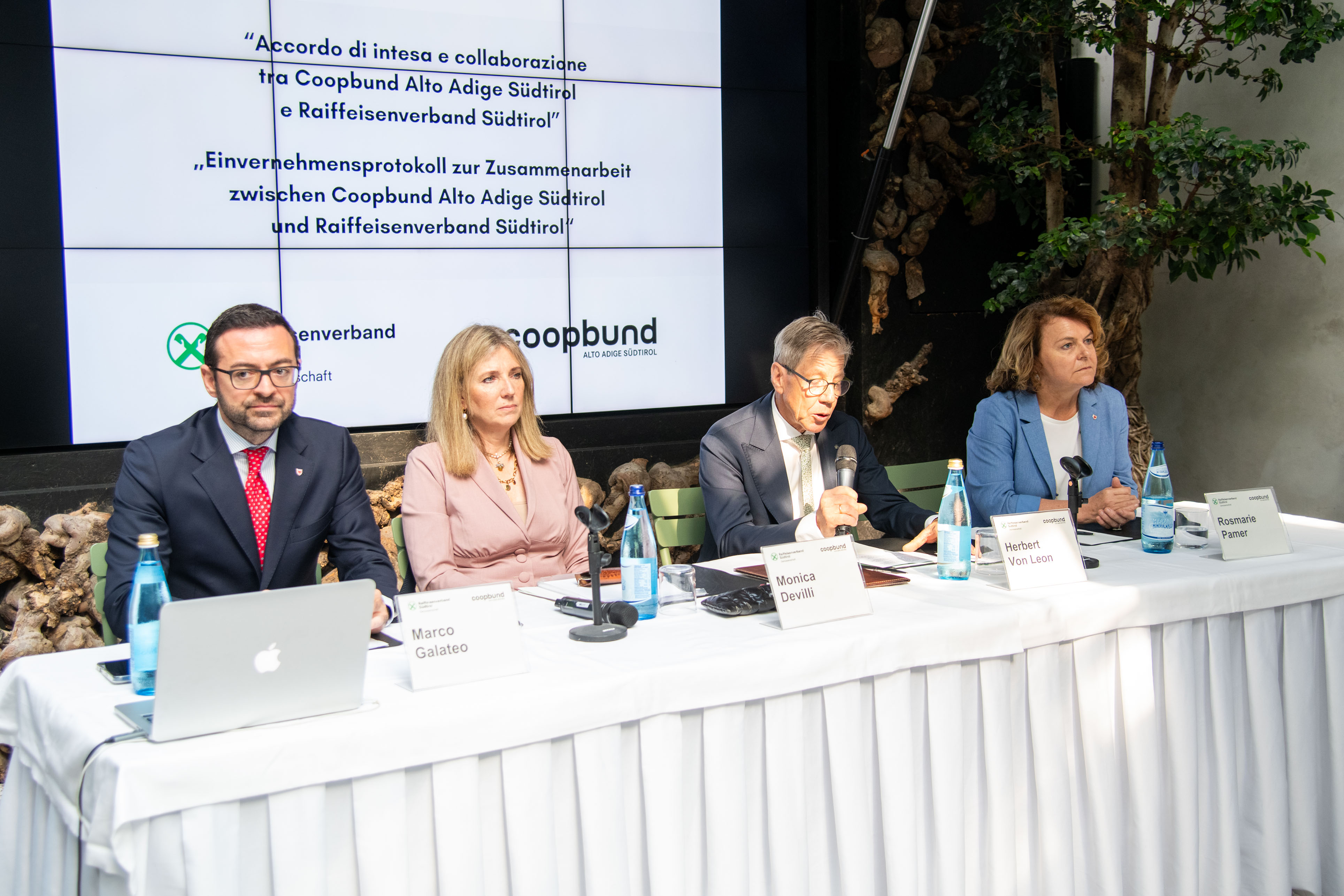 Vorgestellt wurde das Einvernehmensprotokoll zur Zusammenarbeit von Monica Devilli, Präsidentin des Coopbund Alto Adige Südtirol, und Herbert Von Leon, Obmann des Raiffeisenverbandes Südtirol. Unterstrichen wurde die Bedeutung der Initiative durch die Teilnahme der Landeshauptmannstellvertreterin und Landesrätin für Sozialen Zusammenhalt, Familie, Senioren, Ehrenamt und Genossenschaften, Rosmarie Pamer, sowie des Landeshauptmannstellvertreters und Landesrates für Italienische Bildung, Italienische Kultur, Handel und Dienstleistungen, Handwerk und Industrie, Marco Galateo.