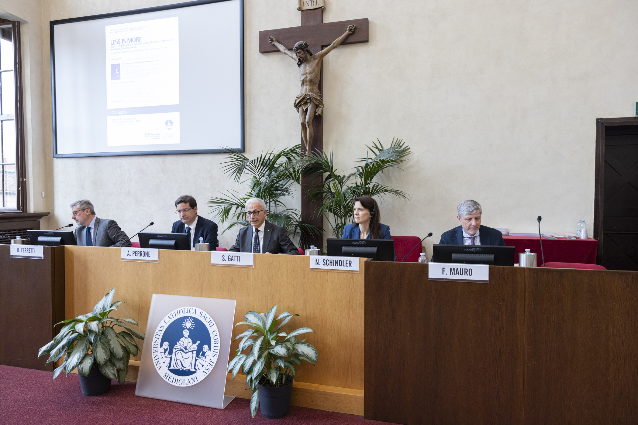 Zu den weiteren hochkarätigen Rednern zählten Filippo Annunziata (Universität Bocconi), Roberto Ferretti (Universität Ca’ Foscari Venedig), Wim Mijs (CEO der Europäischen Bankenföderation – EBF), Francesco Mauro (Europäische Bankenaufsichtsbehörde – EBA), Nina Schindler (CEO der EACB – Europäische Vereinigung der Genossenschaftsbanken).