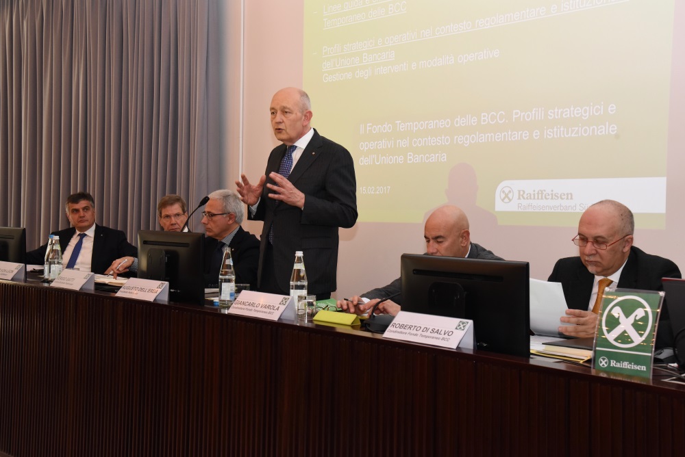 Federcasse-Präsident Dell'Erba ging in seinem Statement auch auf die künftige Südtiroler Raiffeisengruppe ein und betonte, dass der autonome Spielraum für Raiffeisen gegenüber den Zentralstrukturen dadurch größer werde. Den Fondo Temporaneo, der von Federcasse verwaltet wird, bezeichnete er als notwendiges Instrument, um in Krisenfällen von Genossenschaftsbanken (BCC) rasch intervenieren zu können. "Wir brauchen den Fonds, um einen geordneten Übergang zu den neuen genossenschaftlichen Bankengruppen zu garantieren", sagte Dell'Erba. Er betonte, dass dies im allgemeinen Interesse sei und zum Schutz der Einleger sei. Generaldirektor Sergio Gatti, der die Schwerpunkte der Federcasse skizzierte, pflichtete bei: "Der Fonds sei notwendig, um die Stabilität und Nachhaltigkeit der Genossenschaftsbanken zu sichern, denn auch Einzelkrisen könnten zu Systemkrisen führen". Im Anschluss erläuterten Roberto di Salvo und Giancarlo Varola, Federcasse-Vizedirektoren und Co-Direktoren des Fondo Temporaneo, die Modalitäten des Garantiefonds, bevor die Tagung mit einer Fragerunde endete. Generaldirektor Paul Gasser betonte abschließend die Zusammenarbeit mit Federcasse und bedankte sich bei deren Spitzenvertretern für die Teilnahme an der Tagung.