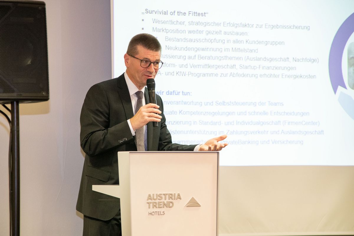 Gerhard Walther, Vorstandsvorsitzender der deutschen VR-Bank Mittelfranken Mitte eG sprach zum Thema „Krisen als Chance nutzen – Wie Genossenschaftsbanken jetzt Vertrauen aufbauen und den Förderauftrag erfolgreich umsetzen können“. Er betonte, dass gerade in der Krise alles getan werden müsse, um als Genossenschaftsbank der Stabilitätsanker in der Region zu bleiben.
