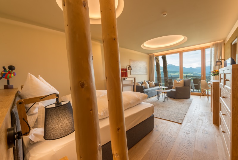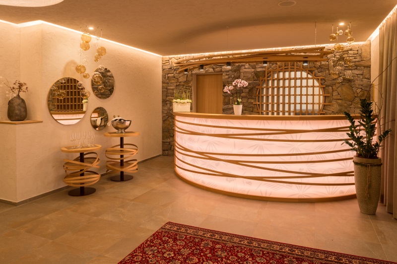 Das Thema Südtiroler Natur spiegelt sich in allen Bereichen des Betriebes wider. Die Außenfassade des Wellnessbereichs ist beispielsweise auf Holzstämme gestützt, die sich bis ins Innere weiterziehen und auch in einigen Gästezimmern vorkommen", beschreibt Gasser weiter. Neuerungen sind in der Hotelbar und im komplett erneuerten Wellness- und Beautybereich erkennbar: die neue Lounge gibt den Blick frei auf die umliegenden Berge. Ausblick gibt es auch vom neuen Hallenbad, Saunabereich und den Ruheräumen."
