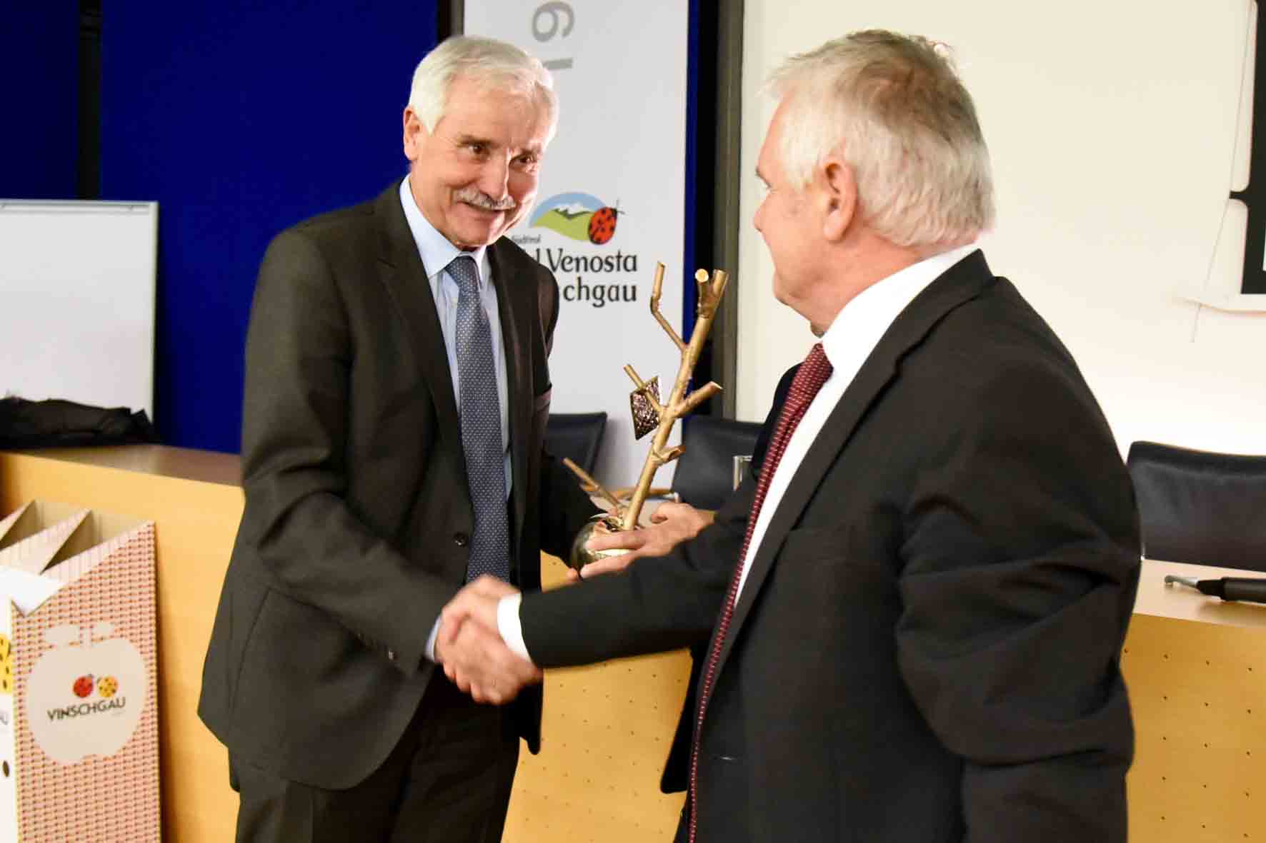 Karl Dietl hat über Jahrzehnte die Vinschgauer Obstwirtschaft und das Genossenschaftswesen entscheidend mitgeprägt. „Du bist ein Pionier im Apfelanbau und hast besonders als Obmann der GEOS und vor allem als VI.P.-Obmann wesentlich zur Weiterentwicklung unseres Systems beigetragen“, sagte Obmann Thomas Oberhofer bei der Vollversammlung am Sitz der VI.P in Latsch. Oberhofer dankte Dietl im Namen der VI.P-Genossenschaften und überreichte ihm als Zeichen der Wertschätzung ein Werk des Künstlers Manfred Alois Mayr.