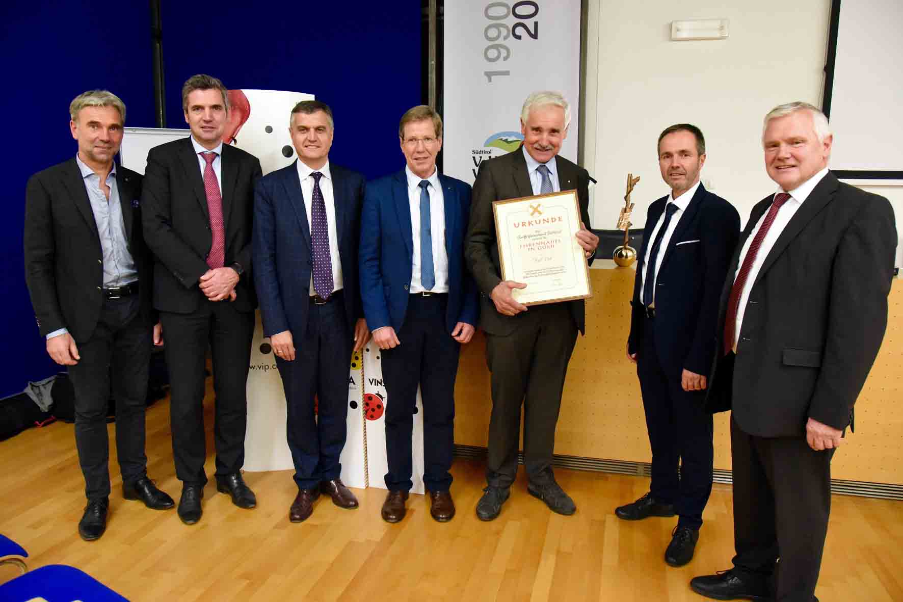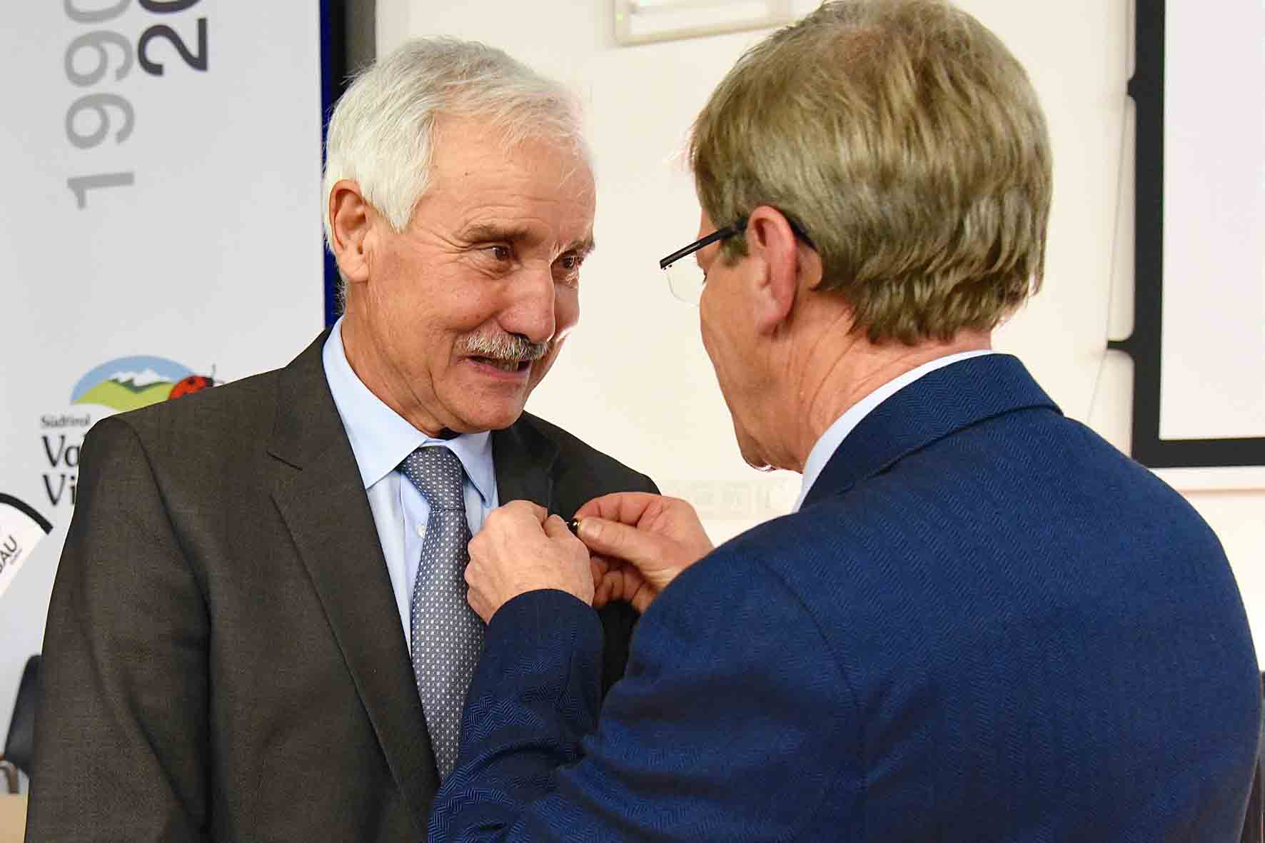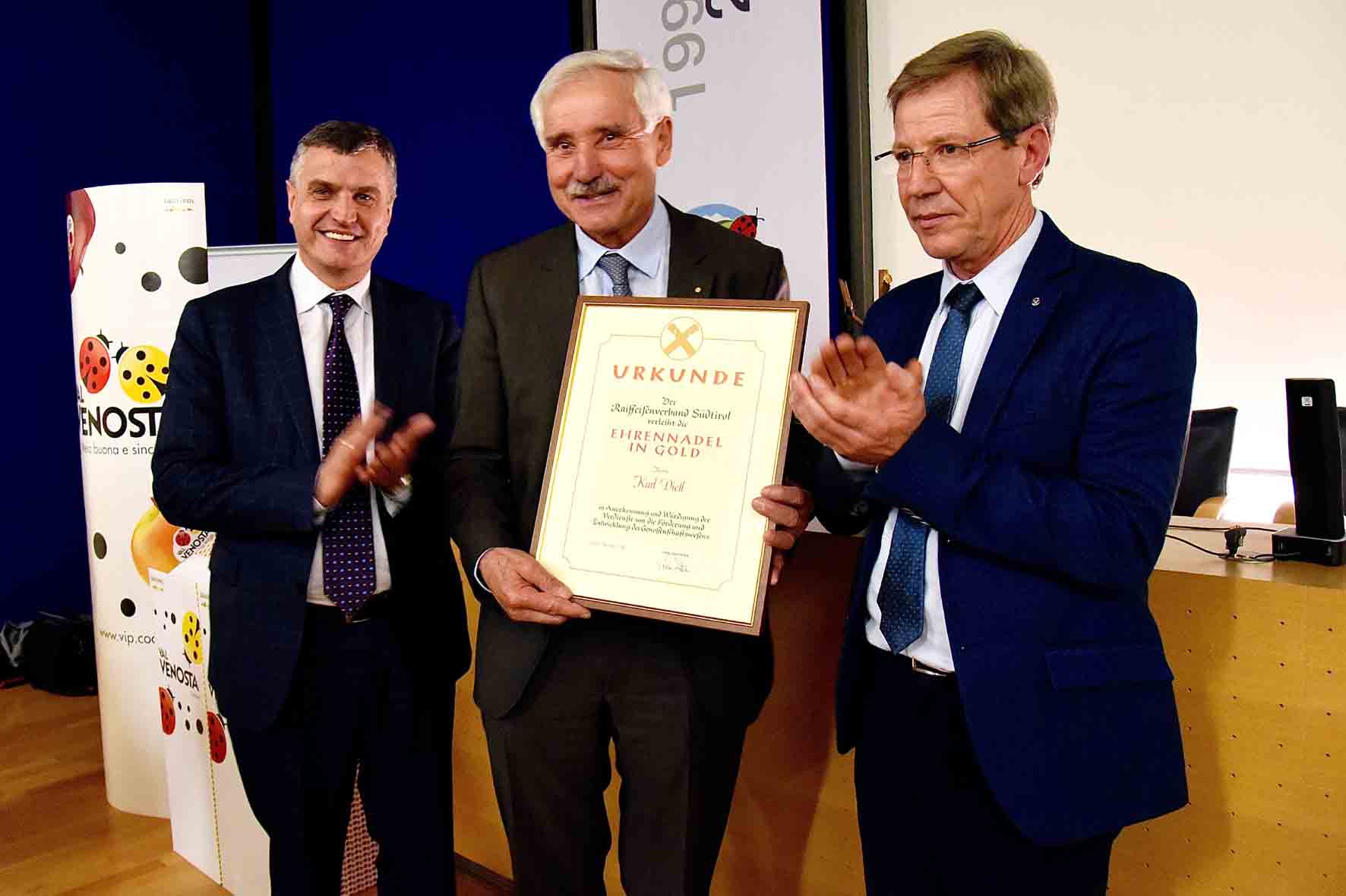 „Karl Dietl hat sich durch sein jahrzehntelanges Engagement um das Genossenschaftswesen in Südtirol bleibende Verdienste erworben“, sagte Herbert Von Leon und überreichte ihm gemeinsam mit Generaldirektor Paul Gasser die Raiffeisen-Ehrennadel in Gold. Mit stehenden Ovationen bekundete die Vollversammlung der VI.P die große Wertschätzung für ihren langjährigen Obmann.