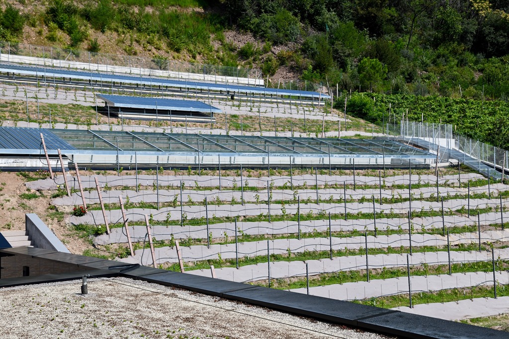 Und das Neue kann sich sehen lassen. Auf einer Fläche von 20.000 Quadratmetern wurde eine Kellerei in den Hang gebaut, wie es sie in Südtirol bisher noch nicht gegeben hat. Dabei ist von außen nur das Verwaltungsgebäude voll sichtbar, das mit seiner Fassade in Form eines stilisierten Rebenblattes aus bronzefarbenem, gelochtem Aluminiumblech einen besonderen Blickfang darstellt. Unter dem mit pilzresistenten Rebsorten bepflanzten Hang befinden sich mehrere Stockwerke, wobei der höchste Punkt der Kellerei auf einer Höhe von 30 Metern liegt, wo sich unter anderem die gesamte Technikzentrale und die Heizanlage für das Verwaltungsgebäude befinden. Dabei erlaubt die Architektur einen Blick von weit oben durch die Kellerei hindurch bis ganz hinunter in den Hof, wobei sich dem Betrachter das Bild eines einzigen homogenen und harmonisch wirkenden transparenten Gebäudes bietet.