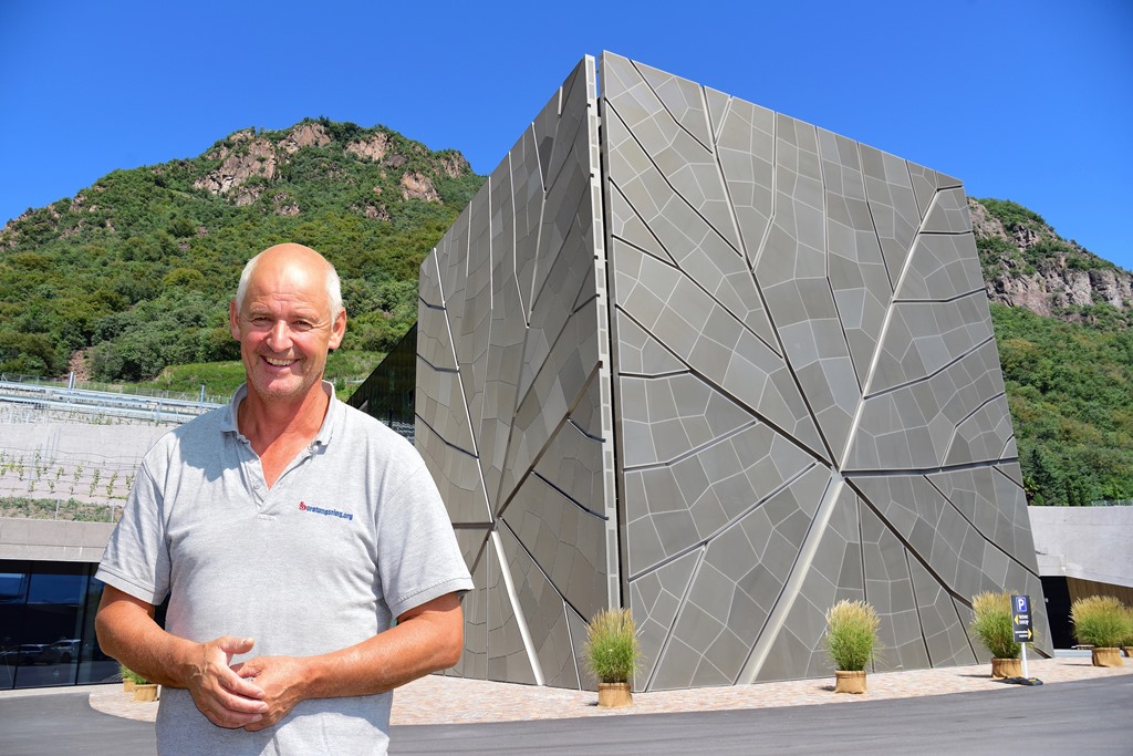 Michael Bradlwarter, Obmann der Kellerei Bozen, vor dem neuen Kellereigebäude in Moritzing bei Bozen: „Eine tolle Geschichte!“