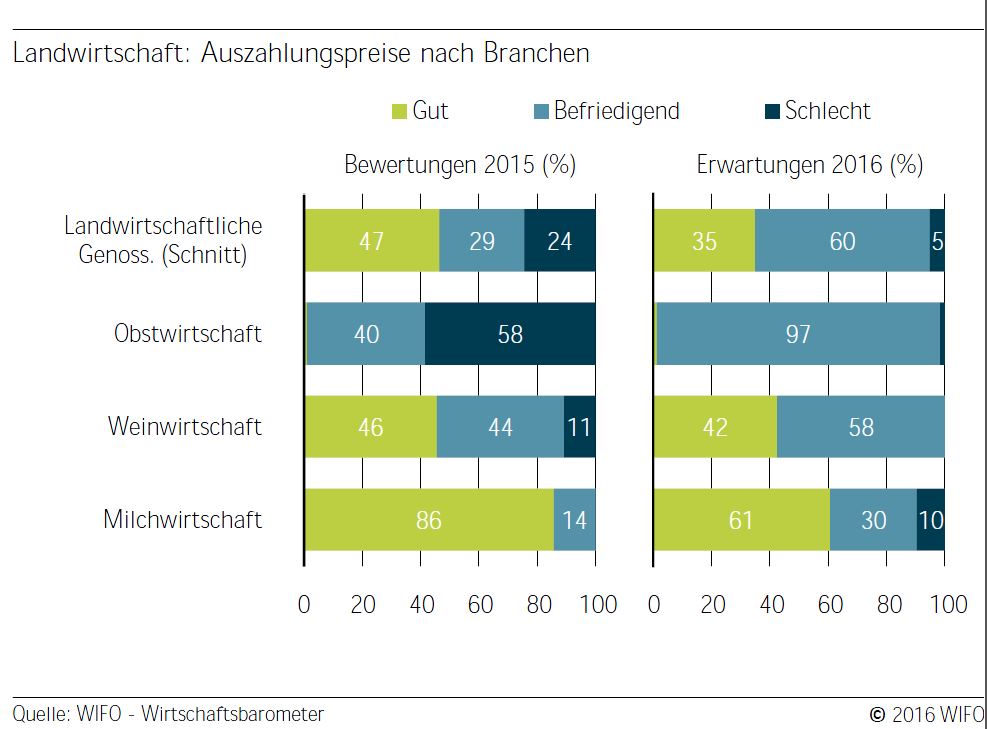 Das Geschäftsklima ist auch in der Milchwirtschaft eher positiv, hat sich aber gegenüber 2015 verschlechtert. Zwar gehen 90 Prozent der Milchhöfe und Sennereien davon aus, dass sie den Milchbauern auch heuer zufriedenstellende Erzeugerpreise auszahlen können, es wachsen aber die Sorgen um die Lage des europäischen Milchmarktes.