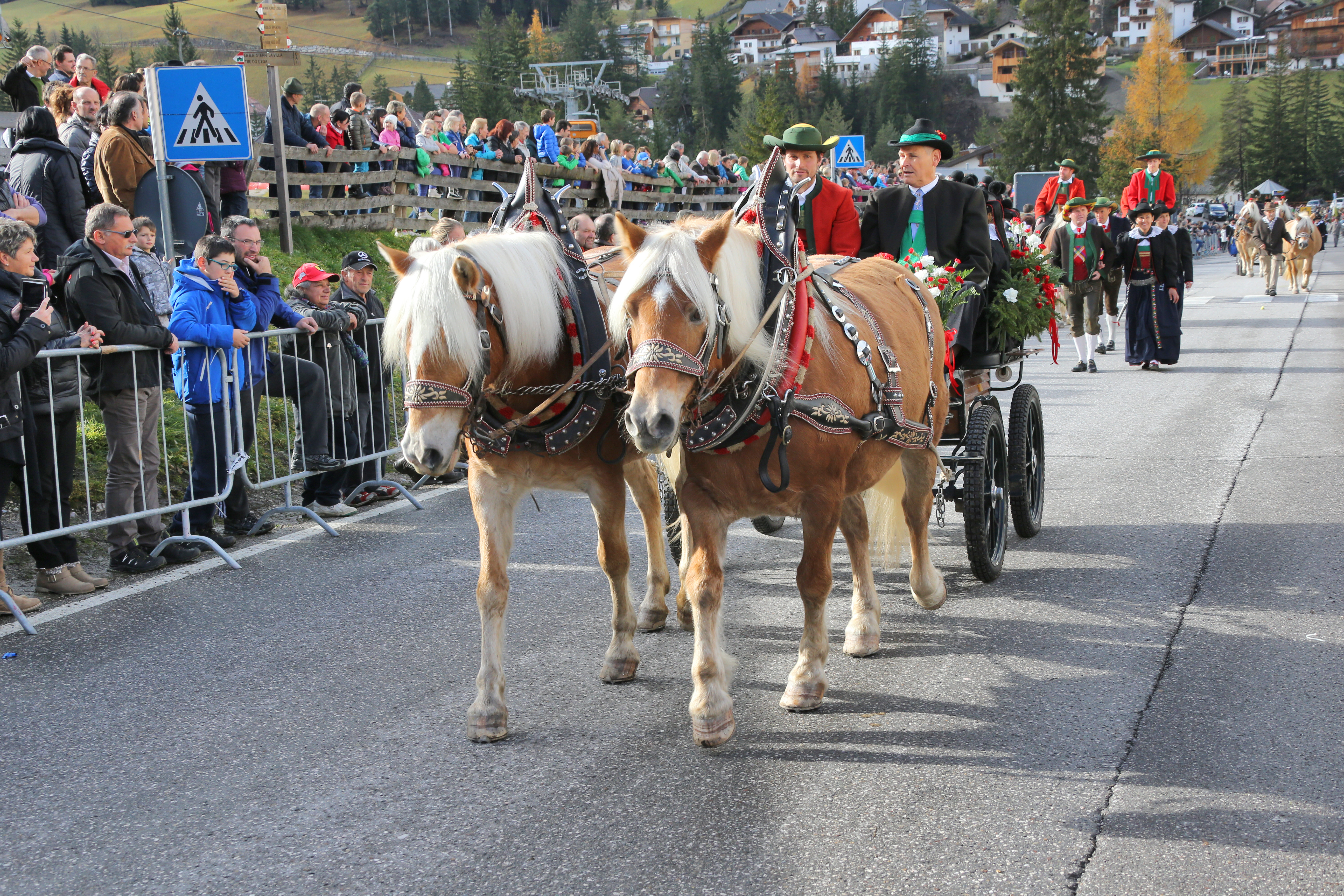 Am Nachmittag spielen die Musikkapellen Vigo di Fassa, Pichl Gsies, die Böhmische Abtei und die Tiroler Burschen und die Volkstanzgruppe des Gadertales zeigt traditionelle Gruppentänze in Tracht. Neben dem Festumzug mit Musik, geschmückten Noriker- und Haflingerpferden, Pferdesegnung durch den Dekan, darf auch die kulinarische Tradition nicht fehlen. Geboten werden ladinische Spezialitäten, Kastanien und Bauernmärkte, im Zelt und im Vereinshaus, deren Erlös einer bedürftigen Familie im Tal zugutekommt. Viele Ladiner aus den umliegenden Dolomitentälern nehmen in Tracht am Umzug teil, um für die abgeschlossene Ernte zu danken und den Schutzpatron um Beistand zu bitten.