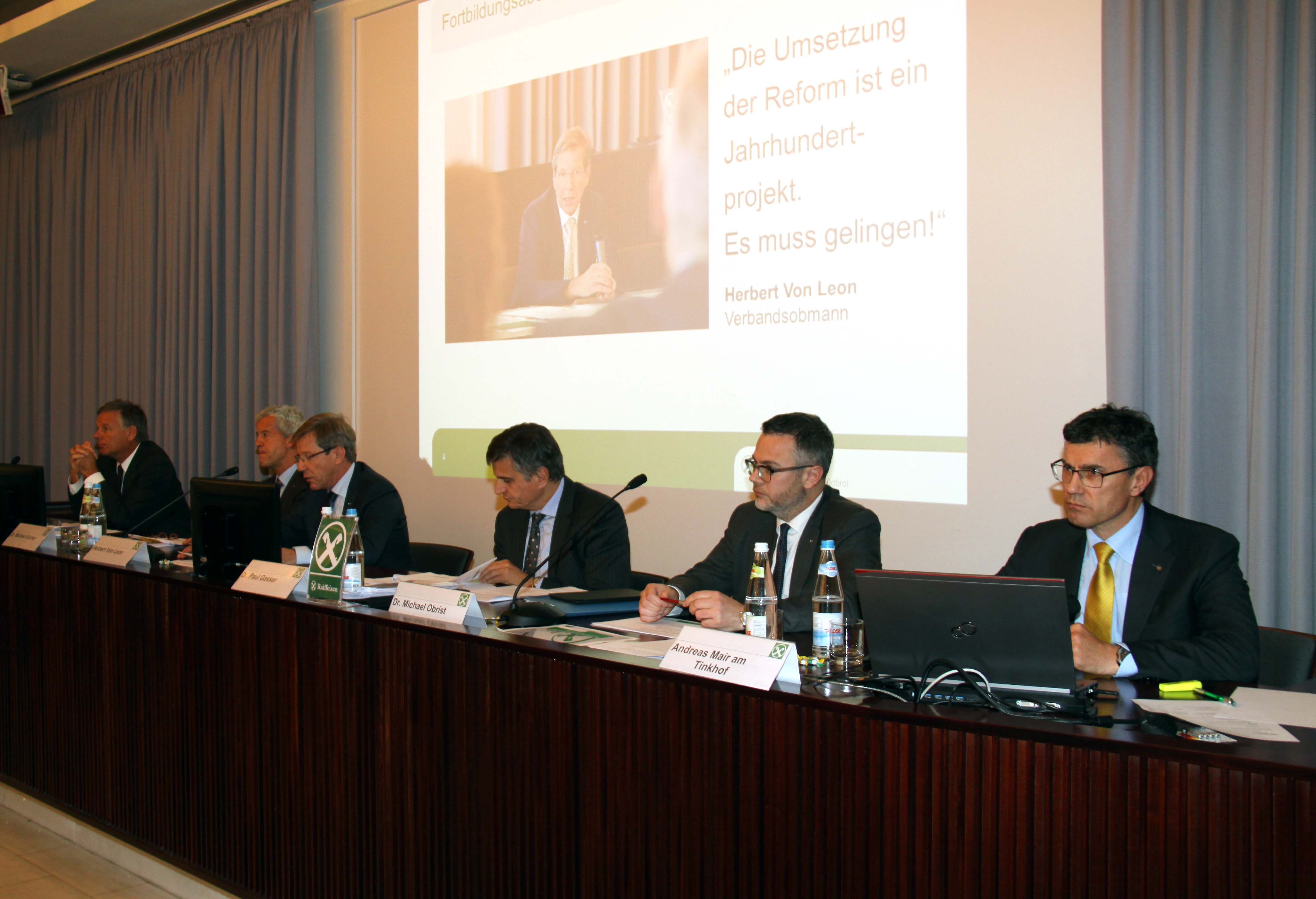 Andreas Mair am Tinkhof, Leiter der Hauptabteilung Bankwirtschaft, stellte das neue Musterstatut der Raiffeisenkassen vor. Im Statut wurde nun u. a. die Zugehörigkeit der Raiffeisenkassen zu einer Genossenschaftlichen Bankengruppe sowie die Übertragung der Befugnisse für die Leitung und Koordination durch die Raiffeisen Landesbank als „Capogruppo“ festgeschrieben. Das Musterstatut muss von der Autonomen Provinz Bozen auf ein bindendes Gutachten der Banca d’Italia und der Raiffeisen Landesbank hin genehmigt werden.