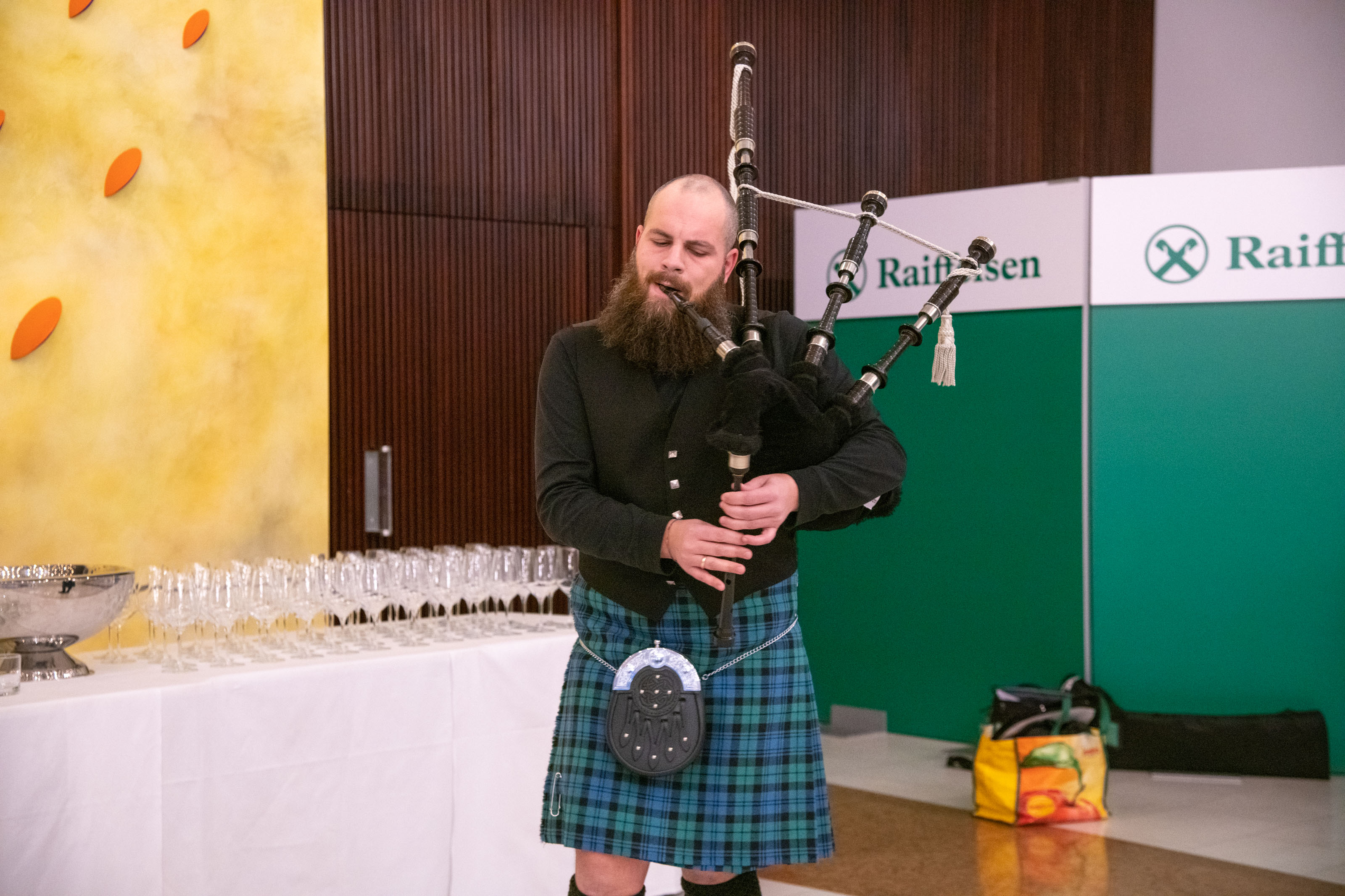 Der Mitarbeiter der RIS Kons.GmbH und Duddelsackbläser Michele Cocca in schottischer Tracht und der Chor des Verbandes unter der Leitung von RIS-Mitarbeiter Julius Ploner umrahmten das Fest musikalisch.