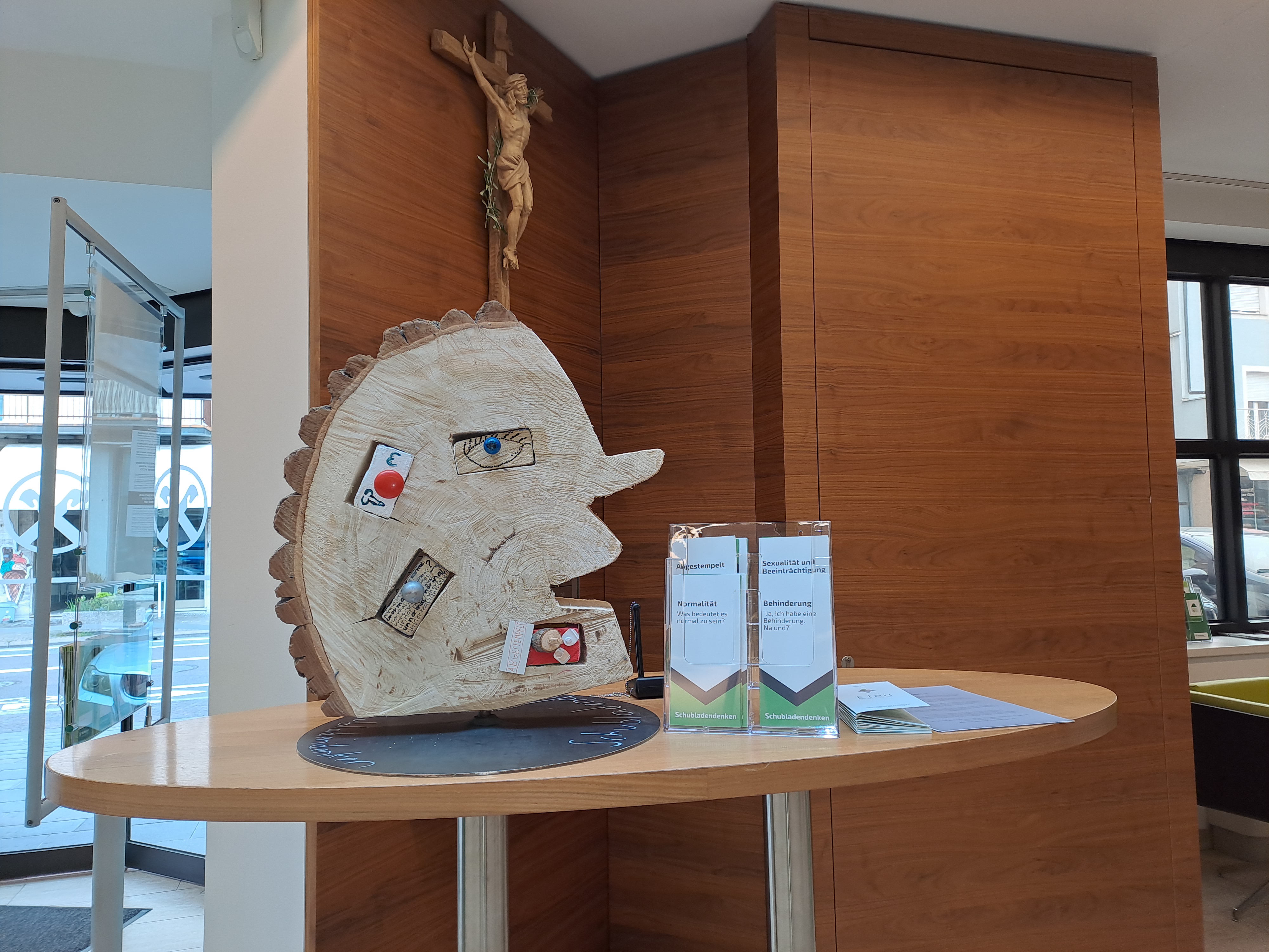 Das Werk „Schubladendenken“, ein aus Holz gefertigter Kopf mit mehreren Schubladen, will die Gesellschaft für das Thema Beeinträchtigung sensibilisieren. In den Schubladen deponiert, finden sich Fragen zum Thema: Wie geht die Gesellschaft mit Menschen um, die eine Beeinträchtigung haben. Was ist Normalität und was bedeutet „abgestempelt“ zu sein. Angestoßen werden auch weniger bekannte Aspekte wie Behinderung und Sexualität. Zu allen Themen gibt es Flyer mit weiterführender Information, Fotos und Eindrücken aus der Arbeit mit den Klient*innen der Sozialgenossenschaft.