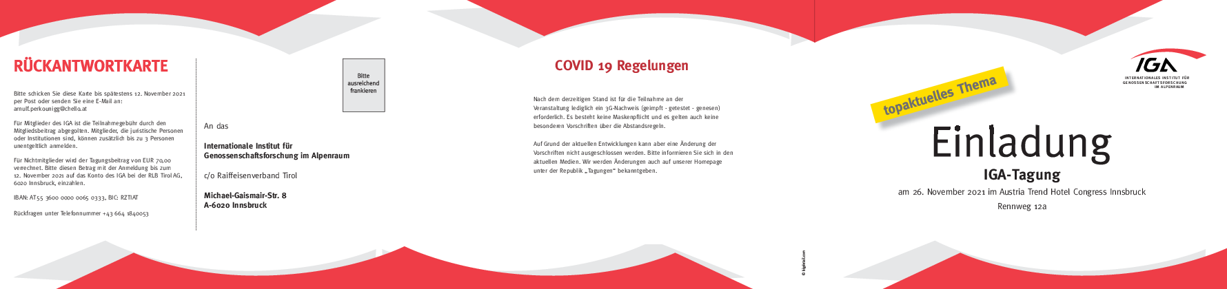 Die Tagung des Internationalen Instituts für Genossenschaftsforschung im Alpenraum (IGA) findet im Austria Trend Hotel Congress Innsbruck, Rennweg 12 a, 6020 Innsbruck mit Beginn um 9.30 Uhr statt und dauert bis 13.00 Uhr.