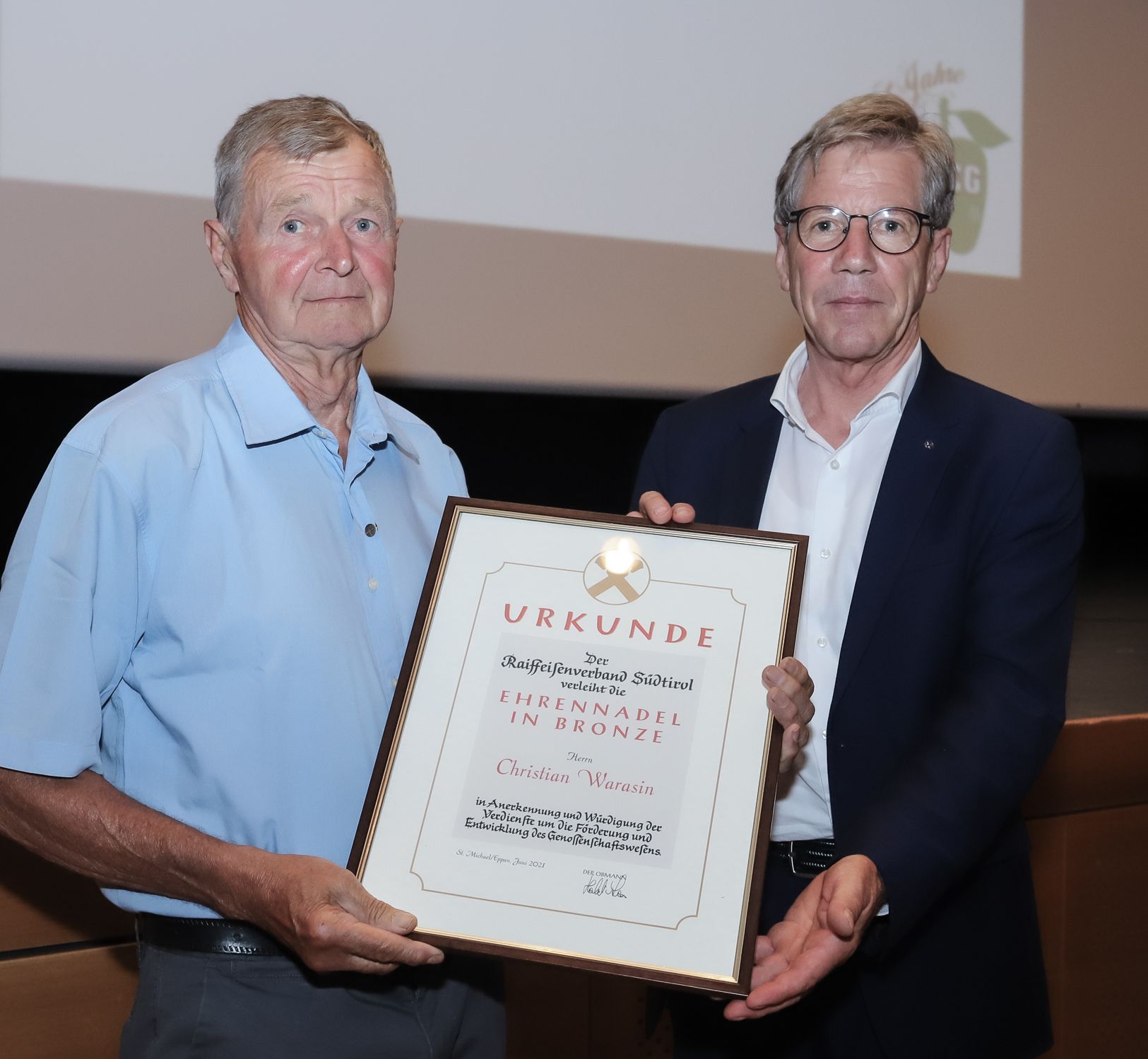Bei der Vollversammlung der Überetscher Einkaufsgenossenschaft ÜBEG Mitte Juni 2021 in Eppan zeichnete Verbandsobmann Herbert Von Leon den langjährigen Obmann-Stellvertreter Christian Warasin mit der Raiffeisen-Ehrennadel in Bronze aus. Christian Warasin hat ein Vierteljahrhundert in der Führung der ÜBEG mitgewirkt. Er wurde 1996 bei der ersten Vollversammlung in den Aufsichtsrat gewählt, 2005 kam er in den Verwaltungsrat und ab 2008 bis zuletzt war er Obmann-Stellvertreter. Herbert Von Leon, Obmann des Raiffeisenverbandes Südtirol betonte im Rahmen der Vollversammlung: „Durch seine Kompetenz und Erfahrung war Warasin stets eine wichtige Ansprechperson in der ÜBEG."