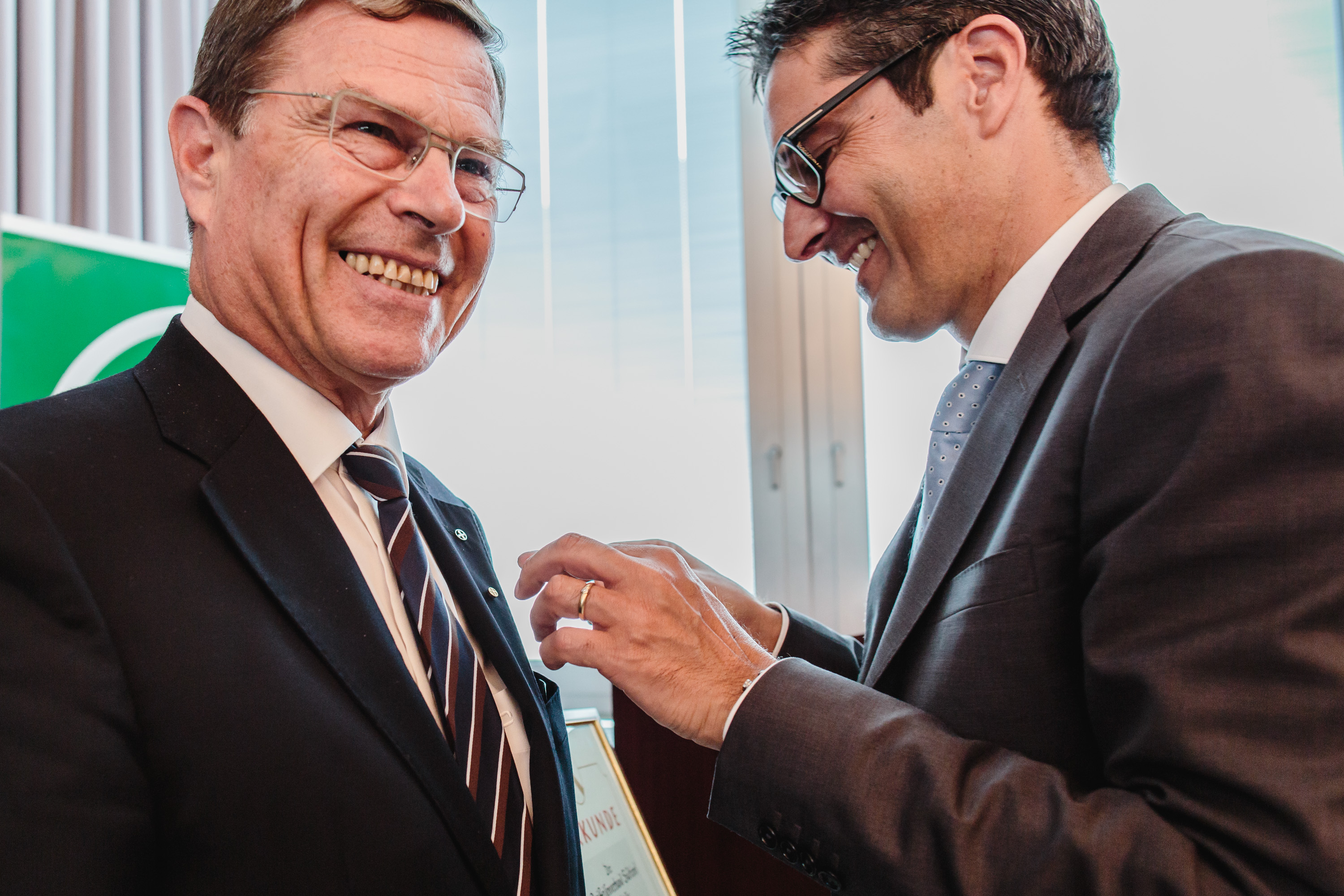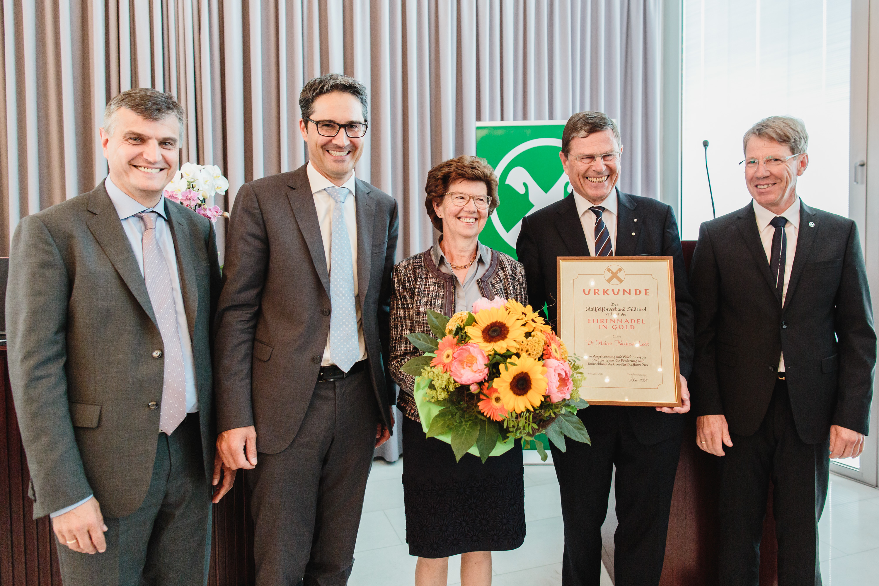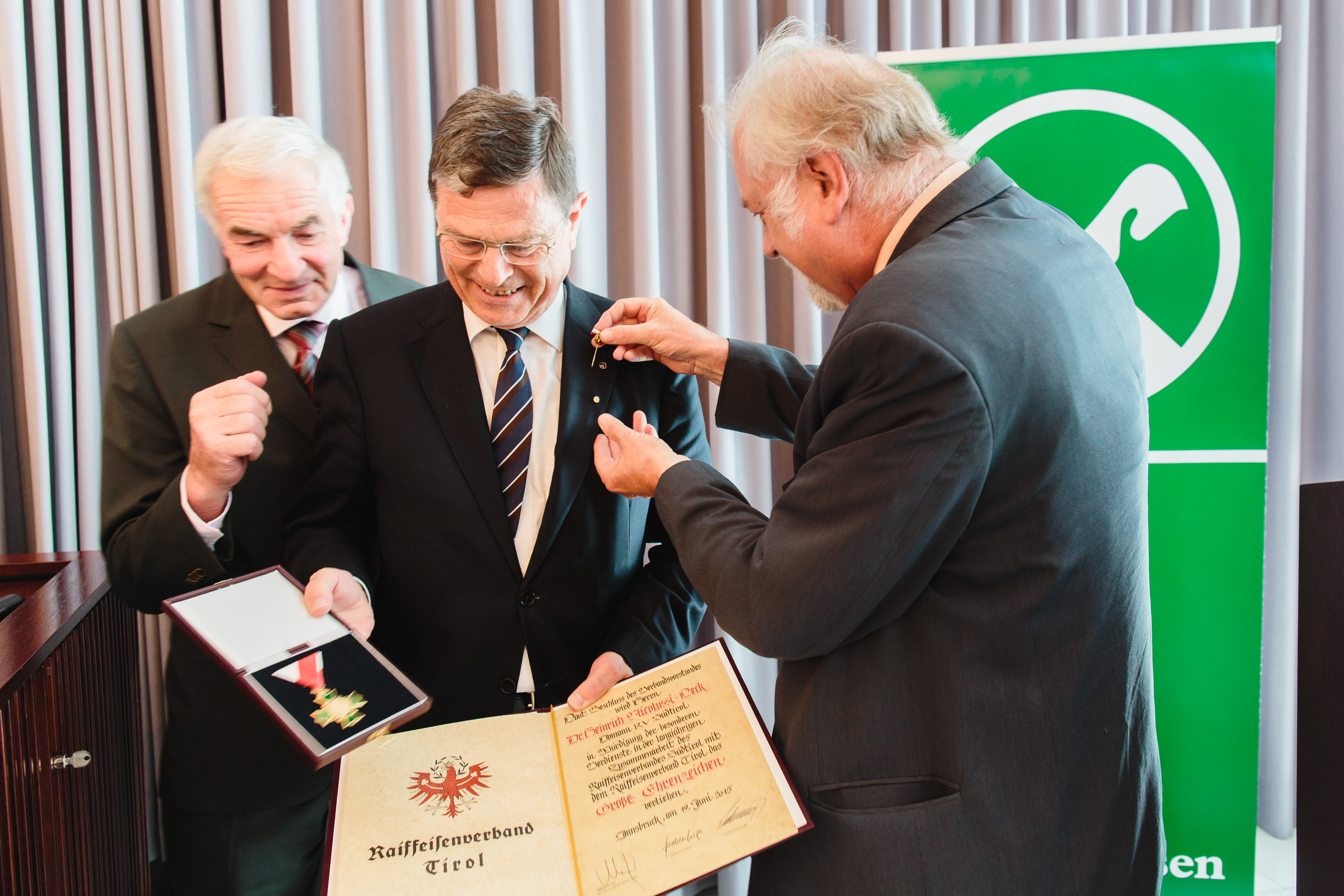 Von Seiten des Raiffeisenverbandes Tirol erhielt Nicolussi-Leck aus den Händen von Obmann Peter Hechenberger und Direktor Arnulf Perkounigg das Große Ehrenzeichen des Raiffeisenverbandes Tirol.