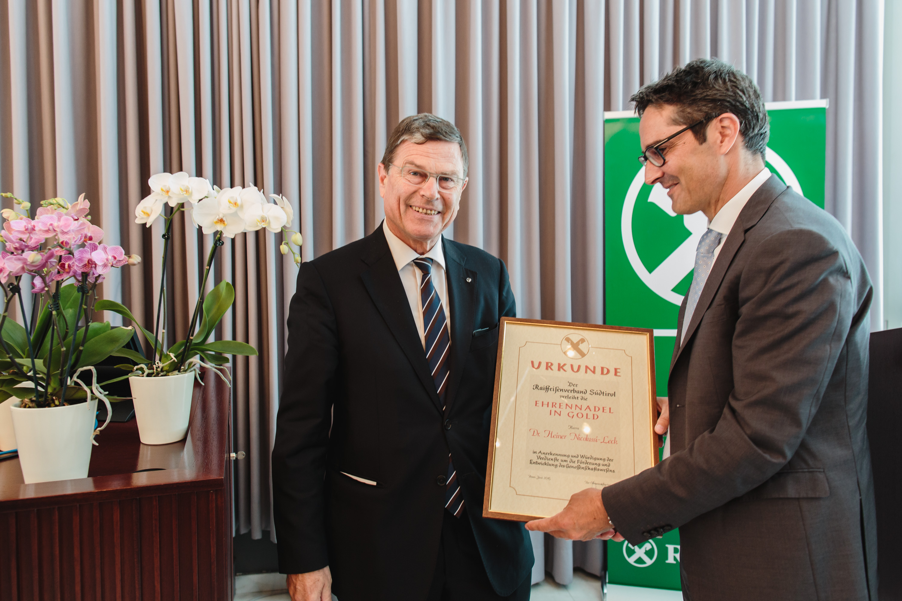 Für seine Verdienste erhielt der scheidende Obmann die goldene Ehrennadel des Raiffeisenverbandes aus den Händen von Landeshauptmann Arno Kompatscher: „Als authentischer Genossenschafter hat Heiner Nicolussi-Leck auf Augenhöhe die jüngste Entwicklung der Raiffeisen Genossenschaften wesentlich mitgeprägt“. Kompatscher bezeichnete den Juristen Nicolussi-Leck al einen „Anwalt der Südtiroler Raiffeisenkassen“ und einen „Hüter der genossenschaftlichen Interessen“, die der scheidende Obmann nicht zuletzt bei der Reform der Genossenschaftsbanken in Rom verteidigt habe.