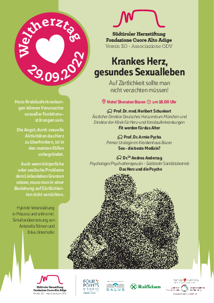 Der Verein „Südtiroler Herzstiftung“ ist Mitglied im Raiffeisenverband Südtirol und hat das Ziel, ein modernes Informations-, Beratungs- und Unterstützungsnetzwerk anzubieten. Anlässlich des Weltherztages am 29. September organisiert der Verein eine hybride Veranstaltung in Präsenz und online zum Thema: „Krankes Herz, gesundes Sexualleben - Auf Zärtlichkeit sollte man nicht verzichten müssen!“