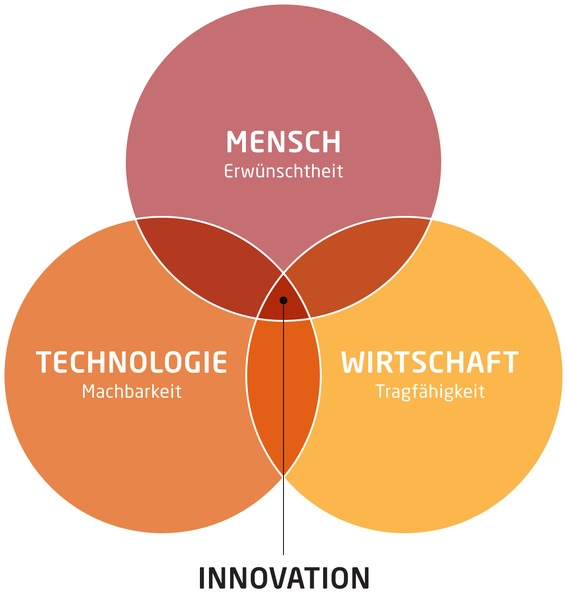 Diese drei Bereiche, Bedürfnisse des Menschen, die technische Umsetzbarkeit und die wirtschaftliche Tragfähigkeit, überschneiden sich. Und genau an der Schnittstelle der drei Bereiche entsteht Innovation. "Die neu entwickelten Produkte und Dienstleistungen decken somit einen bestehenden Bedarf, bringen den Kunden und Nutzern maximalen Nutzen. Die Unternehmen können dadurch den Umsatz steigern und sind am Markt konkurrenzfähiger", so Kuprian weiter.