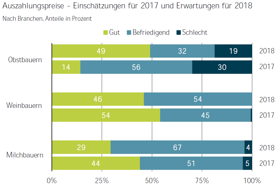 Für das Jahr 2018 wird allgemein eine leichte Besserung des Geschäftsverlaufs erwartet sowie eine Steigerung der Produktionsmenge. Heuer gehen 86 Prozent der Landwirte von zufriedenstellenden Auszahlungspreisen aus.
