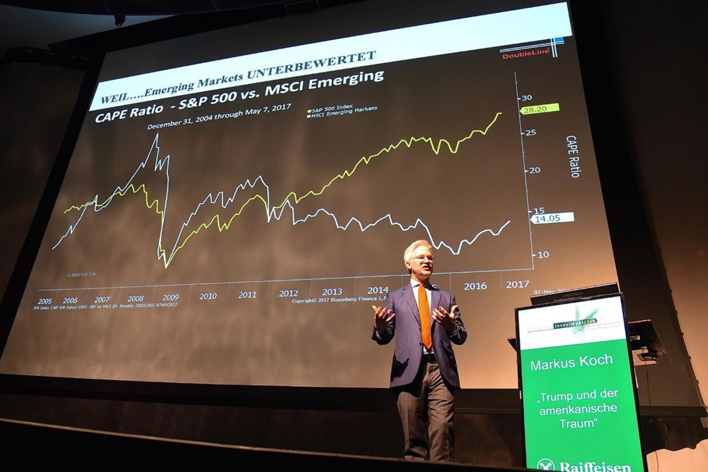 Mit Blick auf den Aktienmarkt bezeichnete Koch die Wallstreet deutlich als zu hoch bewertet, der Aktienmarkt zeige sich besser, als er wirklich ist. "Der US-Aktienmarkt macht heute über 50 Prozent der Weltmarktkapitalisierung aus, aber die US-Wirtschaft stellt nur 24 Prozent der Weltwirtschaft", sagte Koch. Hier herrsche eine große Diskrepanz. Die Chancen für Anleger verlagerten sich zunehmend von den USA nach Europa und in die Wachstumsmärkte Emerging Markets. "Europa hat ein hohes Aufholpotential, mit der Italien-Wahl im nächsten Jahr aber auch schon die nächste Bewährungsprobe vor der Haustüre", meinte Koch.