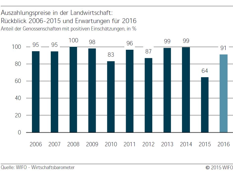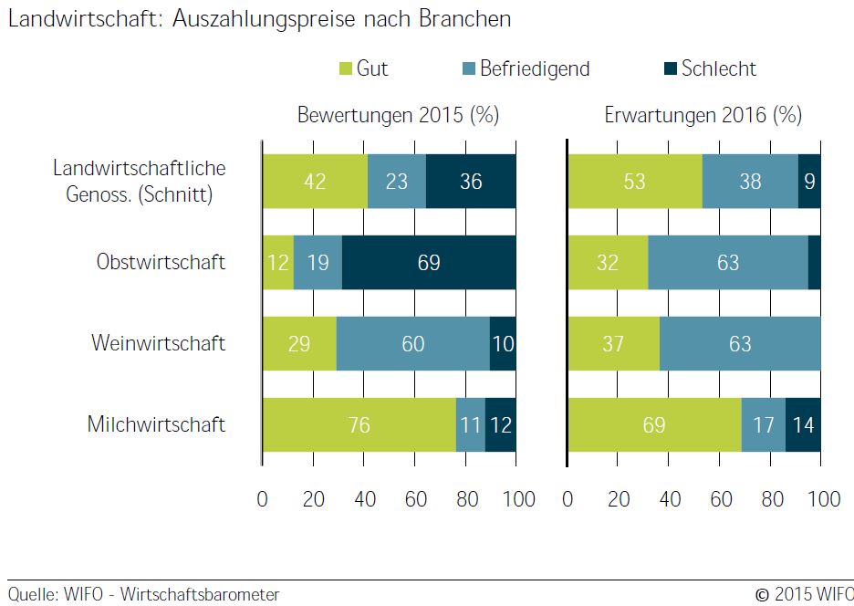 Ähnliches gilt in der Weinwirtschaft: Neun von zehn Kellereien bewerten die Auszahlungspreise an die Weinbauern und -bäuerinnen für das Jahr 2015 als positiv und erwarten ein sehr positives Jahr 2016. Die Weinlese war heuer qualitativ ausgezeichnet und auch die Erntemengen haben wieder das gewohnte Niveau erreicht. Aus diesem Grund gehen für das kommende Jahr alle Kellereien von zufriedenstellenden bis guten Auszahlungspreisen aus.