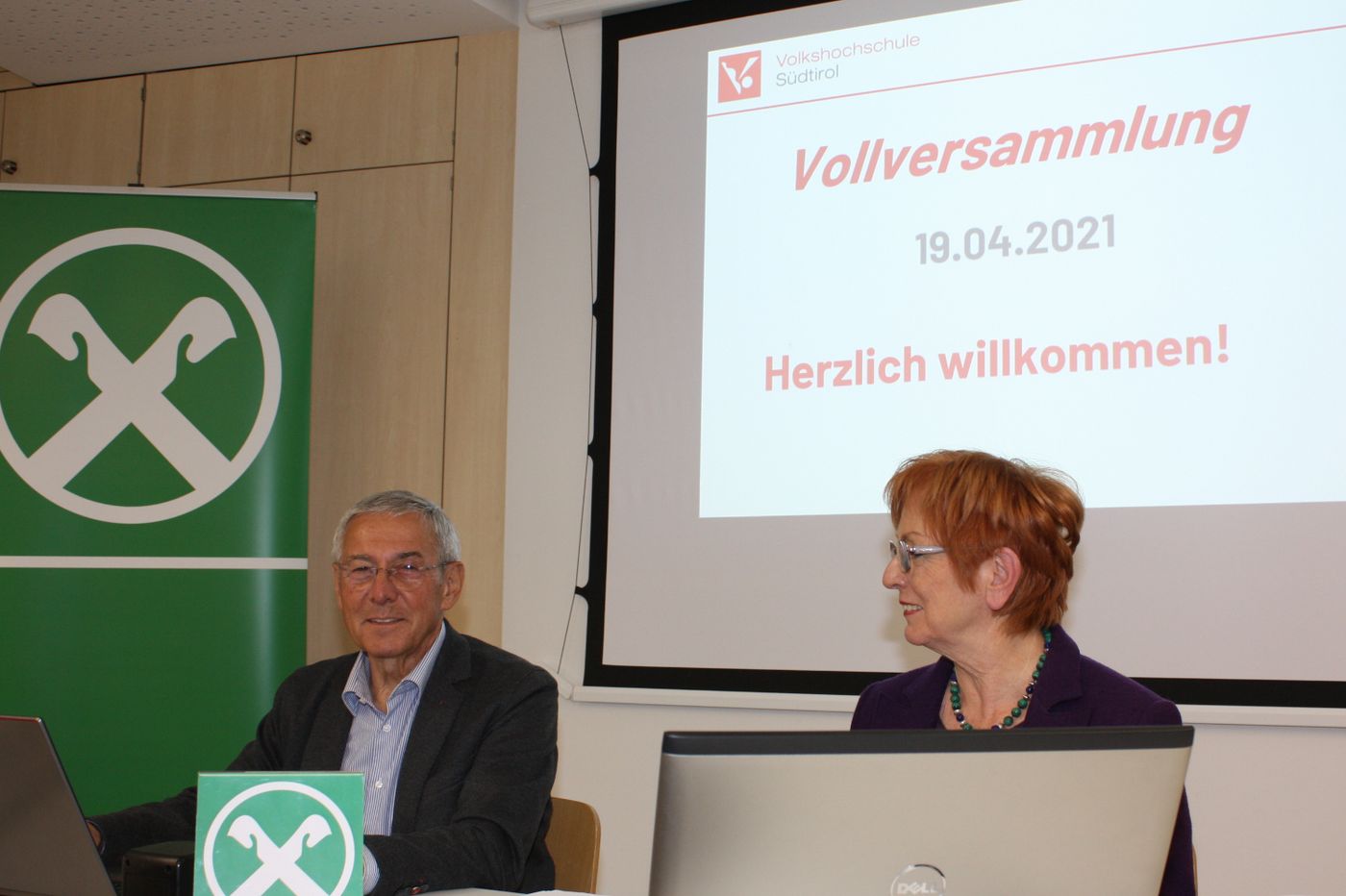 Die Mitglieder und Mitarbeiterinnen der VHS verfolgen die Vollversammlung mittels Videokonferenz. Im Bild: Oswald Rogger, Präsident der VHS Südtirol und Ursula Stadler, Vizepräsidentin der VHS Südtirol. (Foto: Volkshochschule Südtirol)