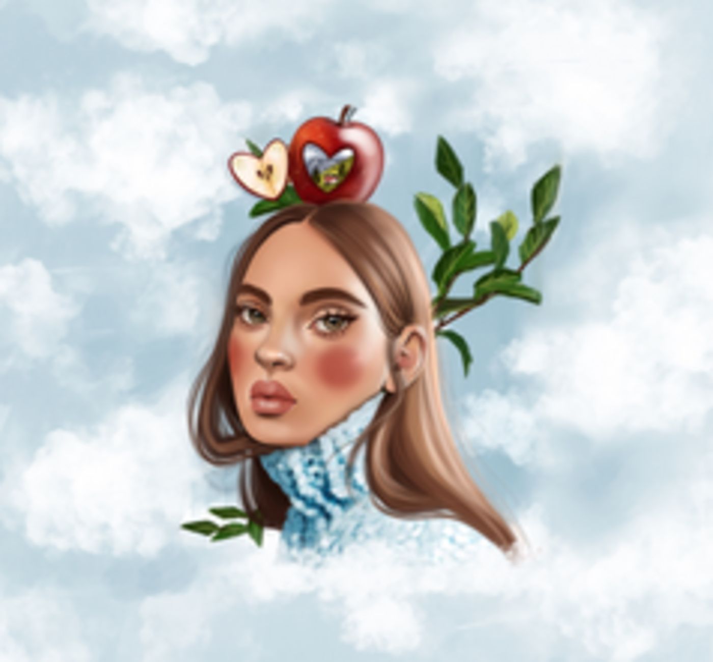 Eine träumende Nymphe mitten in den Apfelwiesen: Ein zauberhaftes Gesicht, das die Natur rundherum erstrahlen lässt, hinter dem wallenden Haar ist die Alpenlandschaft zu erkennen. So sieht Francesca Cito, die Gewinnerin des Digital Contest zum 25-jährigen Jubiläum, die Südtiroler Apfelmarke Marlene®.