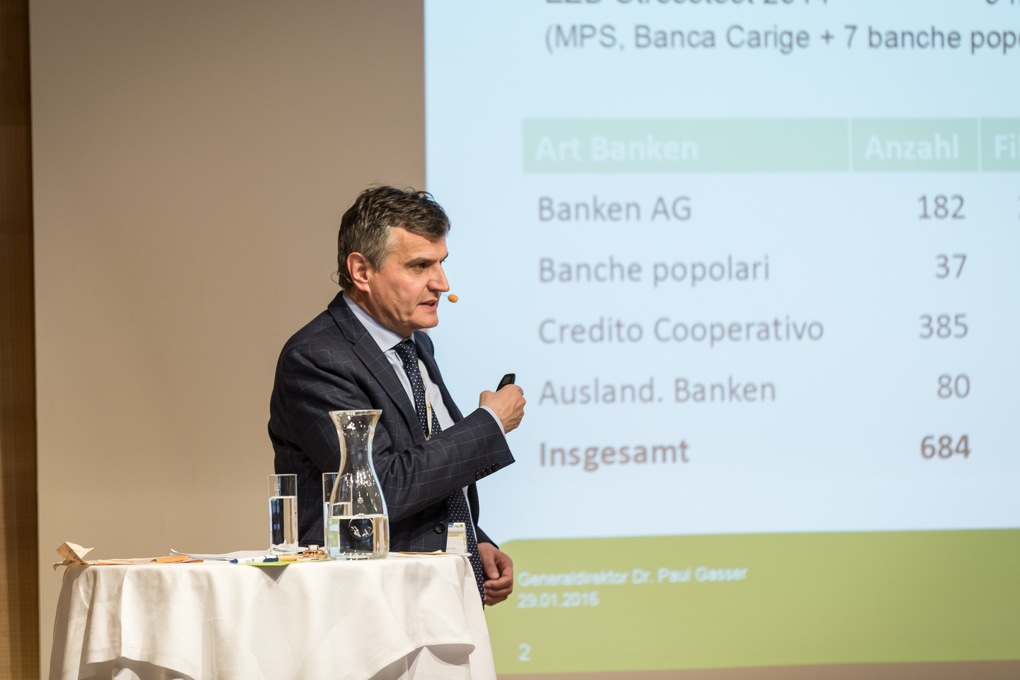 Bei der Informationstagung im Congress Innsbruck informierte Paul Gasser, Generaldirektor des Raiffeisenverbandes Südtirol, in einem Vortrag über den aktuellen Stand der Selbstreform der italienischen Genossenschaftsbanken. Dabei erläuterte er die Gründe einer Sonderlösung für die Südtiroler Raiffeisenkassen. Man habe sich vehement für die Bildung einer eigenen Bankgruppe eingesetzt, um nicht der nationalen Gruppe eingegliedert zu werden. Auf diese Weise könne die Autonomie der einzelnen Raiffeisenkassen in Zukunft weitgehend gesichert, gleichzeitig aber auch die Zusammenarbeit effizienter gestaltet werden.