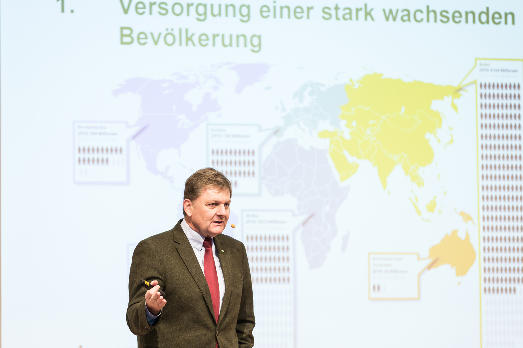 Reinhard Wolf, Generaldirektor der Raiffeisen Ware Austria AG, zeigte den Einfluss globaler Megatrends auf die internationalen Agrarmärkte auf. Eine der größten Herausforderungen sei die Versorgung der wachsenden Weltbevölkerung (bis 2050 über 9 Mrd. Menschen). Die Nachfrage u. a. nach Fleisch oder Getreide wachse extrem, gleichzeitig schrumpfe aber die Ackerfläche pro Kopf stark. Hinzu komme, dass der Klimawandel die Ertragssituation in vielen Ländern  arg verschiebe. So gehe z. B. in Afrika die Bodenfruchtbarkeit bedenklich zurück, die Bevölkerungszahl steige aber am stärksten an. Dies berge ein hohes Bedrohungspotential in sich, meinte Wolf.