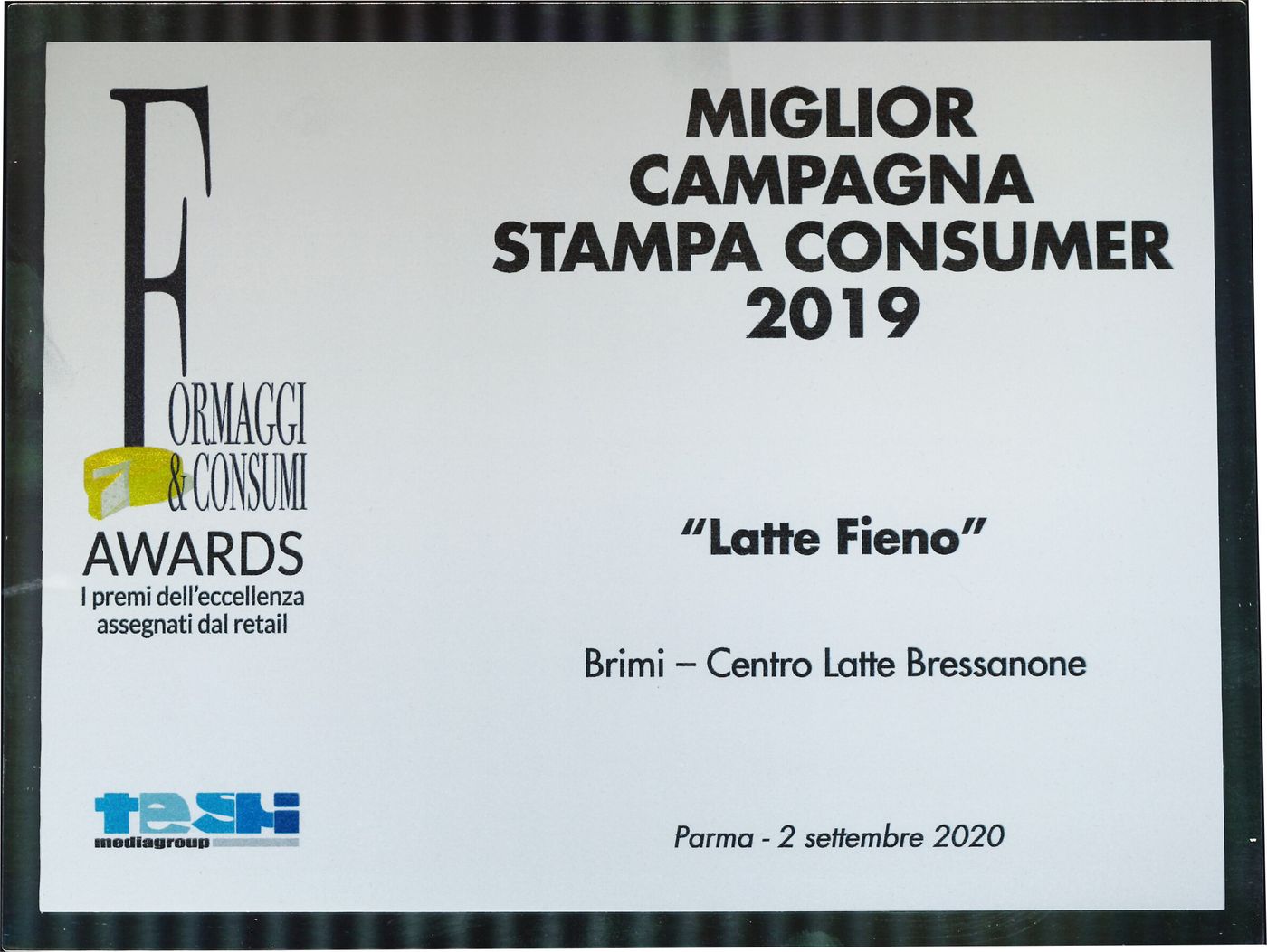 Brimi kandidierte in der Kategorie „Beste Werbekampagne Print 2019“ mit ihrer Heumilch Produktlinie. Das Ziel der Werbekampagne war es die Heumilch Mozzarella-Produktlinie italienweit beim Konsumenten noch bekannter zu machen.