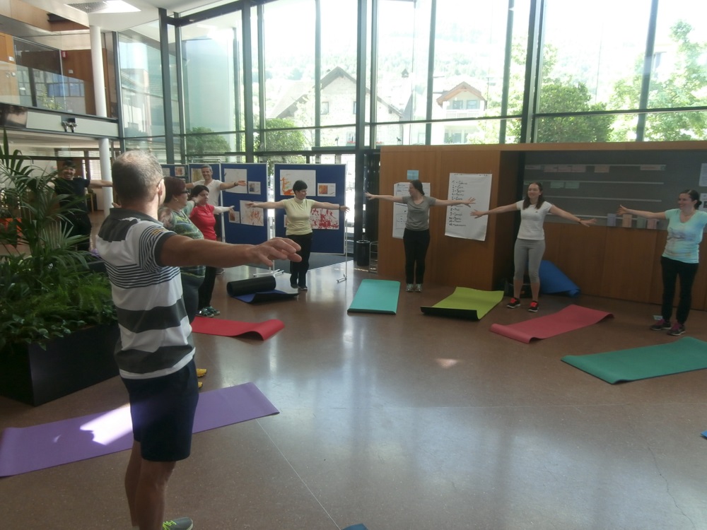 Ende Mai war Raiffeisen.goes.gsund mit "Bewegung und Sport zeitgemäß verstehen - optimale Strategien im Berufsalltag" bei der Raiffeisenkasse Prad-Taufers zu Gast. Dabei stand die Frage nach einer zeitgemäßen Interpretation von Bewegung und Sport im Mittelpunkt. Der Sportwissenschaftler Michele Cattani präsentierte den MitarbeiterInnen der Raiffeisenkasse Prad-Taufers, wie Stereotype und einschränkende Haltungs- und Bewegungsmuster vermieden werden können und wie man Haltung, Stoffwechsel, Herzkreislauf und psychisches Wohlbefinden verbessern kann. Anhand von praktischen Beispielen, einzeln-Paar- und Gruppenarbeiten wurden die vermittelten theoretischen Ansätze erprobt und in die Praxis umgesetzt.