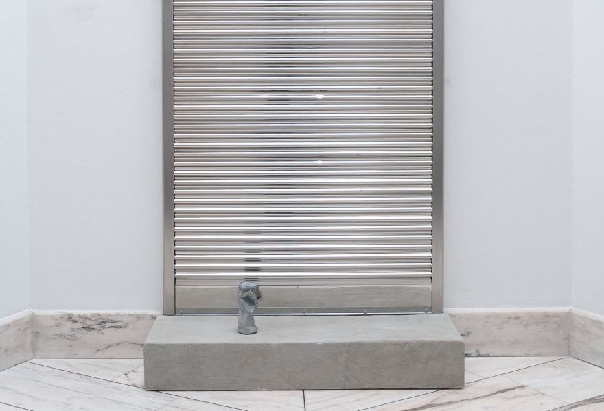Mit der Arbeit „Doorstep“ montierte Tschurtschenthaler ein leicht zerbeultes Rolltor aus Edelstahl an die Wand, das man über eine Betonstufe erreichen kann. Auf dieser Stufe steht eine zerdrückte Aluminium-Dose.