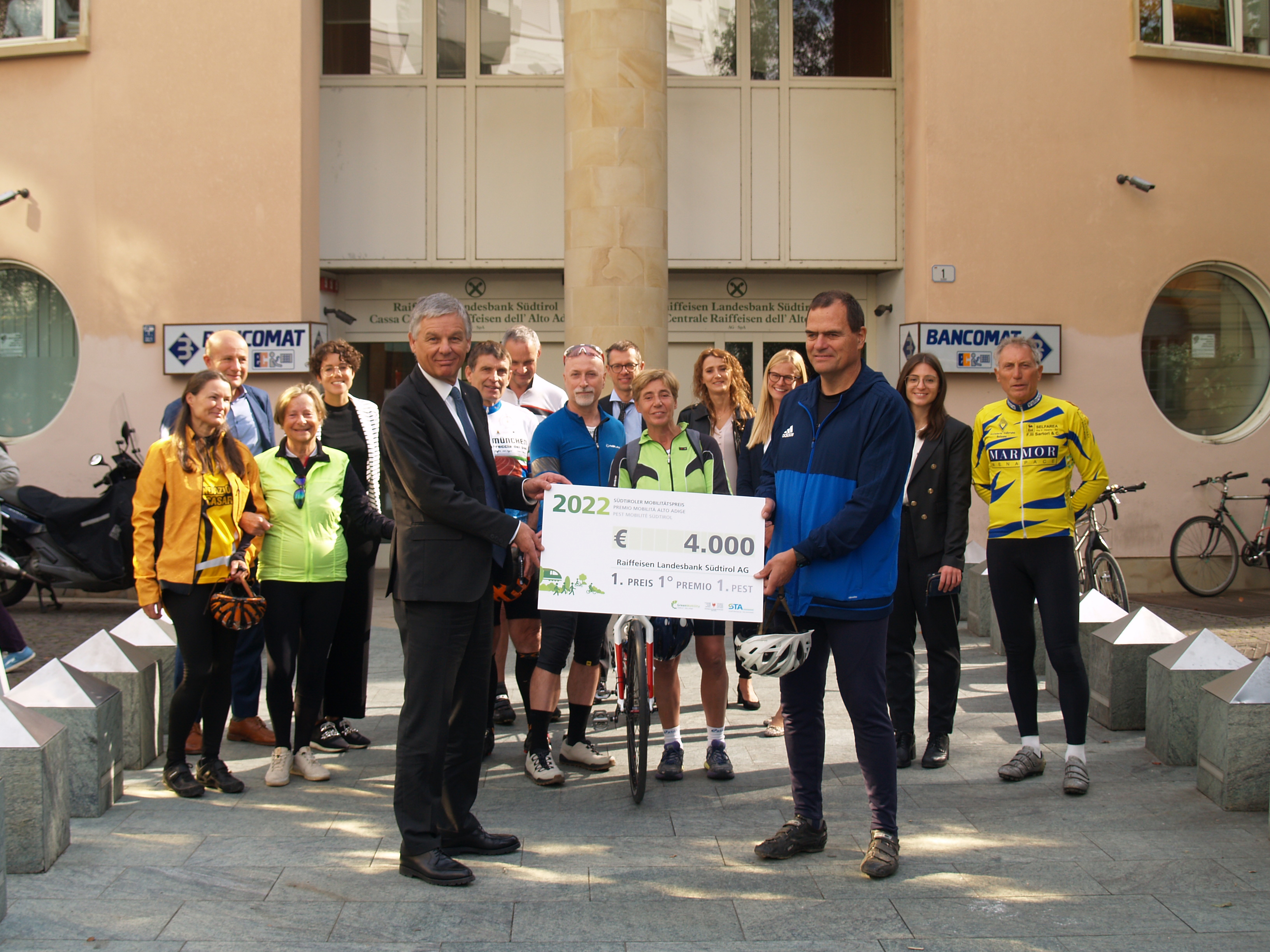 Dank ihres Mobilitätsplans und des entsprechenden Maßnahmenpakets für nachhaltige Unternehmensmobilität ist die Raiffeisen Landebank Südtirol eine der beiden Siegerinnen des heurigen Wettbewerbs für nachhaltige Mobilität, der vom Bereich Green Mobility der STA – Südtiroler Transportstrukturen AG organisiert wurde. Mobilitätslandesrat Daniel Alfreider gratulierte dem Generaldirektor der Raiffeisen Landesbank Südtirol, Zenone Giacomuzzi, und überreichte den Siegerscheck in Höhe von 4.000 Euro.
