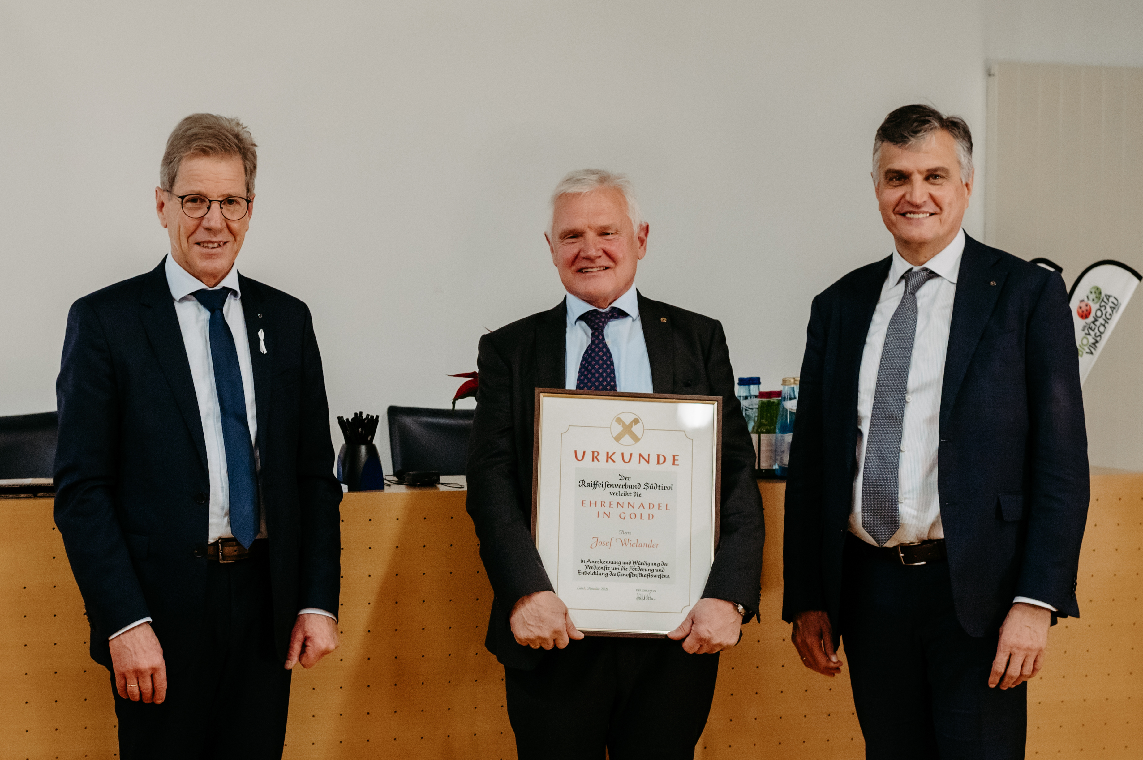Josef Wielander, langjähriger Direktor des Verbandes der Vinschger Produzenten für Obst und Gemüse VIP, wurde für seine Verdienste um das Genossenschaftswesen mit der Raiffeisen-Ehrennadel in Gold ausgezeichnet.