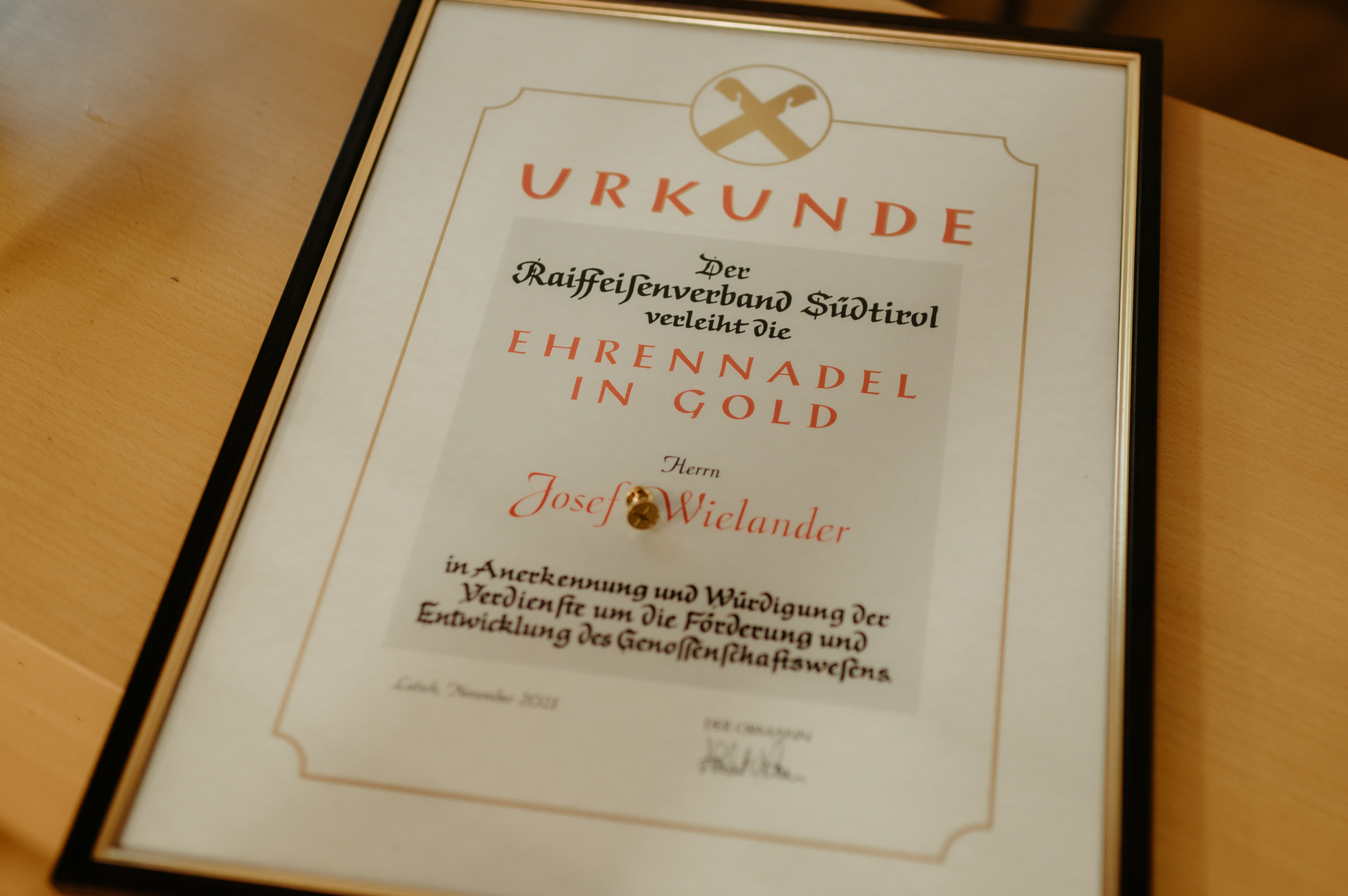 Nach 43 Jahren Einsatz für die Vinschgauer Obstwirtschaft trat Josef Wielander am 31. März 2019 in den Ruhestand. Nach mehreren Corona-bedingten Verschiebungen konnte am 26. November im Rahmen der VIP-Vollversammlung die Verleihung der Raiffeisen-Ehrennadel in Gold vorgenommen werden. Anwesend waren neben der Führungsspitze und den Mitgliedern von VIP auch der Landesrat für Landwirtschaft Arnold Schuler sowie Raiffeisenverband-Obmann Herbert Von Leon und Generaldirektor Paul Gasser. „Sepp Wielander erwies sich als erfahrener und weitsichtiger Kapitän, der die positive Entwicklung der Vinschgauer Obstwirtschaft maßgeblich mitgeprägt hat“, so VIP-Obmann Thomas Oberhofer und VIP-Direktor Martin Pinzger. „Wenn der VIP heute als erfolgreicher Obstverband dasteht, ist dies auch der Verdienst von Josef Wielander, der stets den Zusammenhalt unter den Genossenschaften und unter den Bauern in den Vordergrund stellte“, sagte Herbert Von Leon, Obmann des Raiffeisenverbandes, in seiner Laudatio.