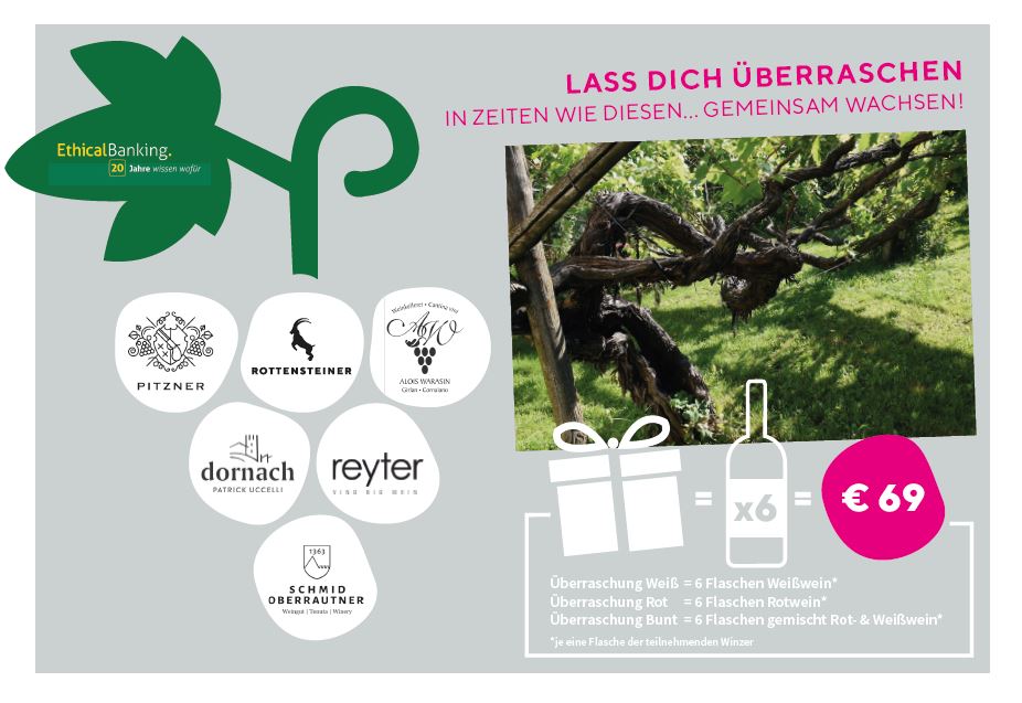 In Zeiten wie diesen istEthical Banking der Raiffeisenkasse Bozen ein Anliegen, nicht nur als ethische Bank-Dienstleister aufzutreten, sondern konkrete Schritte für ein solidarisches Wirtschaften und Solidarität in schwierigen Zeiten zu setzen. Die Aktion “Lass dich überraschen“ soll allen Interessierten lokale Weinproduzenten näher bringen, die Möglichkeit eröffnen neue Sorten und Eigenbau-Kellereien kennenzulernen und gleichzeitig Produzenten und Konsumenten in neuer Form zusammenzubringen.