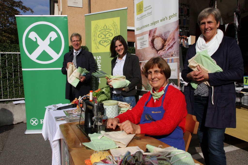 Herbert Von Leon, Obmann des Raiffeisenverbandes, verteilte gemeinsam mit Landesbäuerin Egger die selbstgenähten Gemüse- und Obstbeutel: „Die Bäuerinnen haben sich die Nachhaltigkeit auf die Fahne geschrieben und deshalb unterstützen wir gerne dieses Projekt. Ich wünsche ihnen den nötigen Erfolg dazu.“