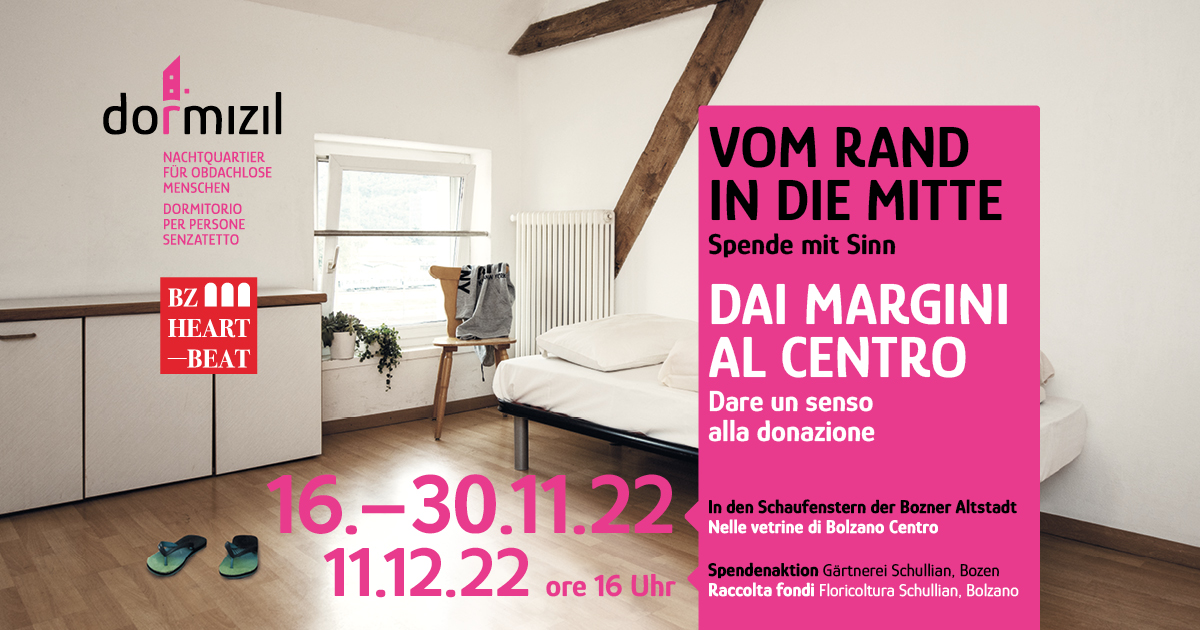 Im Nachtquartier dormizil in der Rittner Straße in Bozen finden 25 obdachlose Menschen in den Wintermonaten ein warmes Bett. Ermöglicht hat dies eine Initiative von neun Privatpersonen, die im Jahr 2020 den Verein housing first bozen EO gegründet haben. Ihr Ziel ist es obdachlosen Menschen eine menschenwürdige Einrichtung im Herzen von Bozen zu bieten. Das Nachtquartier dormizil wird ausschließlich von Freiwilligen getragen und ist auf Spenden angewiesen. Das ist auch der Grund, warum die Bozner Genossenschaft BZ Heartbeat dieses Jahr das Nachtquartier dormizil unterstützt und eine Aktion zu dessen Gunsten organisiert hat: Am 16. November anlässlich des Internationalen Tags für Toleranz präsentiert BZ Heartbeat Möbel aus dem Nachtquartier dormizil in Magenta getaucht in den Schaufenster einiger Mitglieder und weist mit markanten Sätzen und Aussagen von obdachlosen Menschen auf deren Herausforderungen hin.