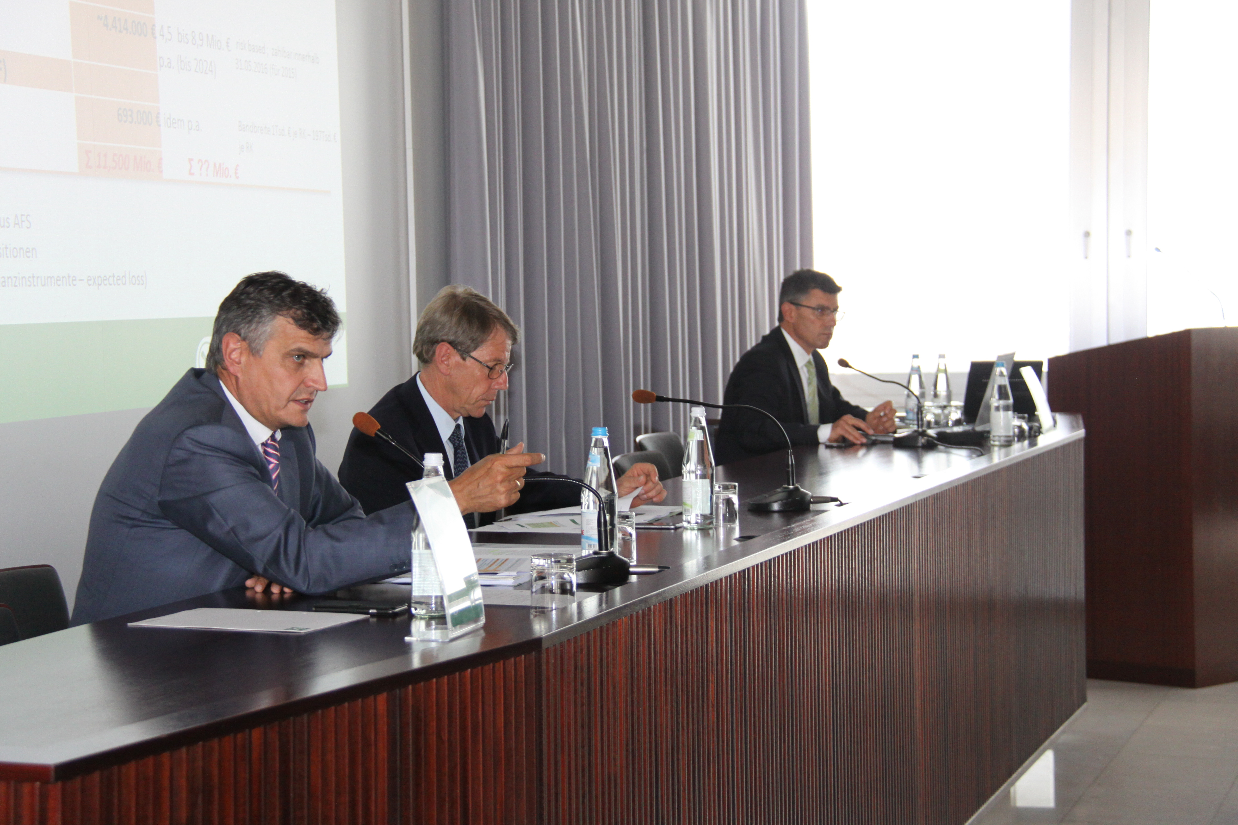 Generaldirektor Paul Gasser, Obmann Herbert von Leon und Leiter der Hauptabteilung Bankwirtschaft Andreas Mair am Tinkhof bei der Infotagung für die Geschäftsführer