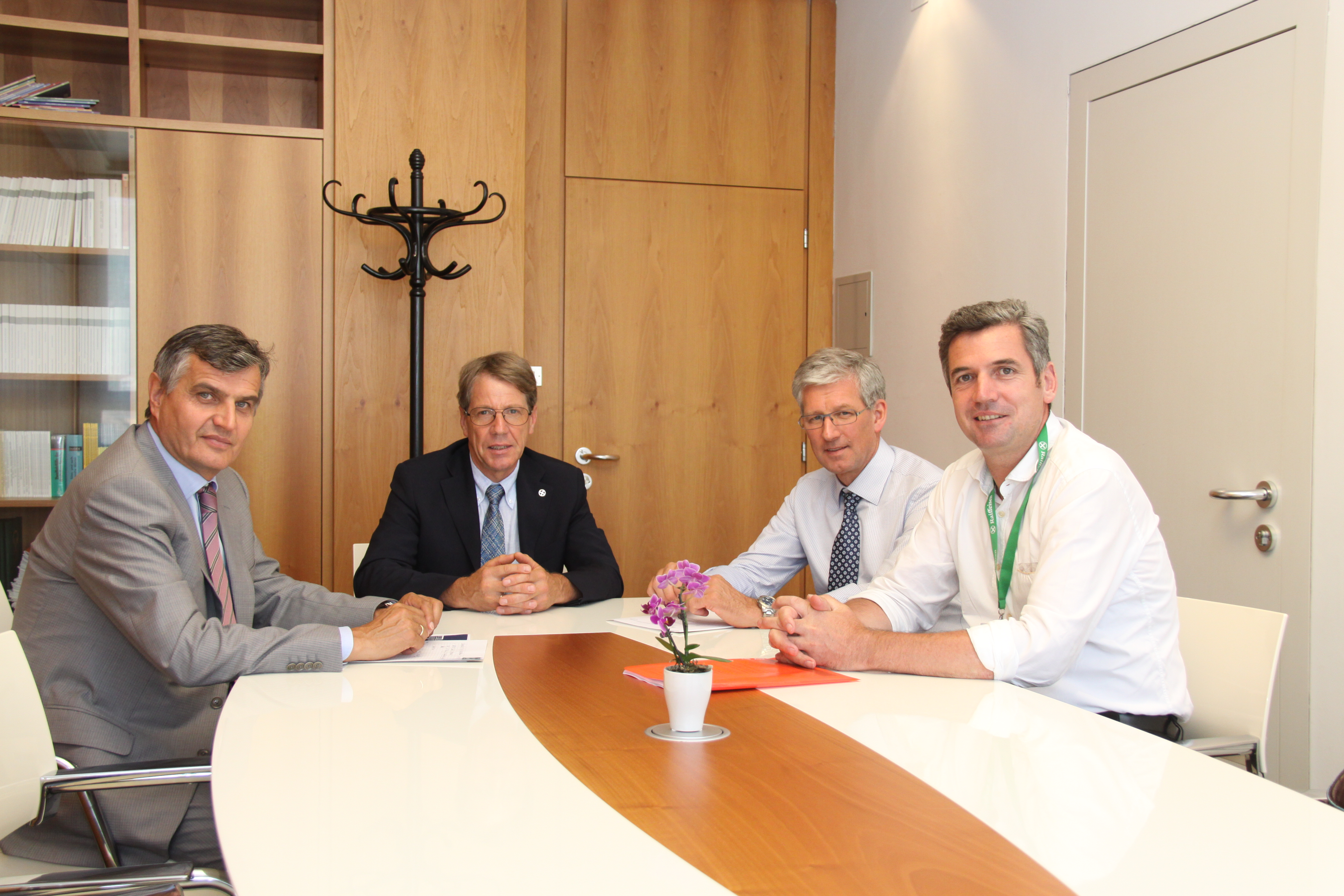 Gemeinsam mit Generaldirektor Paul Gasser und Revisionsdirektor Robert Nicolussi diskutierten Von Leon und Dorfmann für den Raiffeisenverband wichtige Angelegenheiten. Themen dabei waren die europäische Bankenunion und deren Auswirkungen auf das Südtiroler Bankenwesen, sowie die Finanzierungsmöglichkeiten mit Hilfe des ESFI, des Europäischen Fonds für strategische Investitionen.