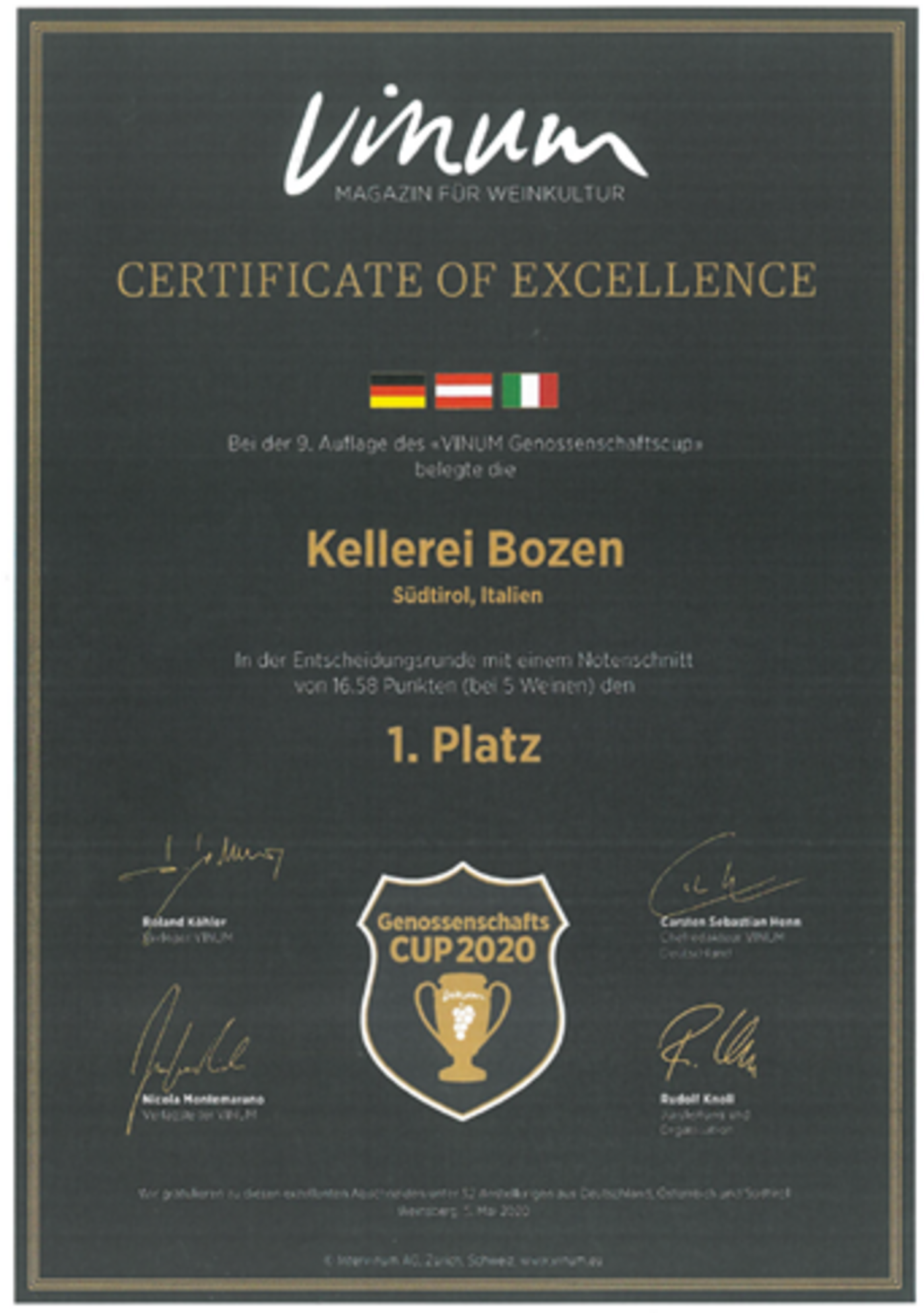 Beim „9. Internationalen Genossenschaftscup“ des europäischen Weinmagazins VINUM erreicht die Kellerei Bozen Rang 1 und lässt die Konkurrenz aus Deutschland, Österreich und Südtirol hinter sich. Für die Kellerei eine Bestätigung ihrer Arbeit.