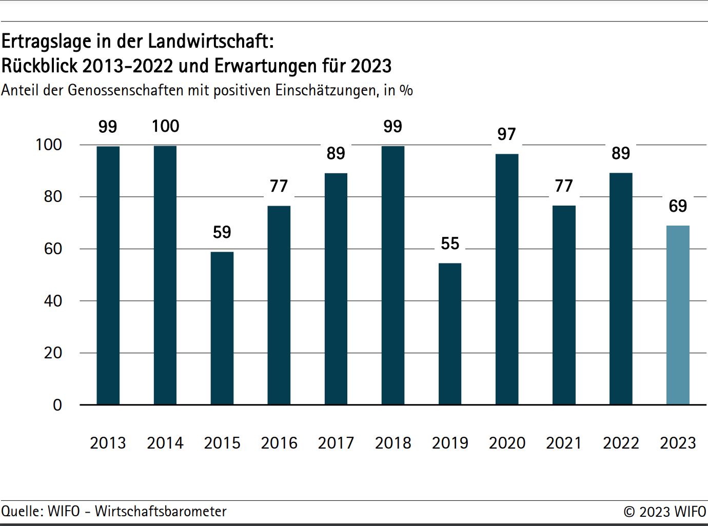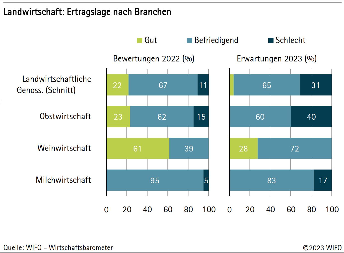 Der Südtiroler Weinsektor zeigt sich weiterhin zuversichtlich. Die Ertragslage im Jahr 2022 wird von allen befragten Kellereien als zumindest befriedigend bewertet, in fast zwei Drittel der Fälle sogar als gut. Die Ernte im vergangenen Herbst erbrachte 507.000 Dezitonnen Trauben, woraus über 357.000 Hektoliter Wein produziert wurden. Dies sind 12,4 Prozent mehr als im Vorjahr. Auch wenn die Umsatzprognosen für das Jahr 2023 verhalten sind, insbesondere was den italienischen Markt betrifft, werden die Ertragslage und die Auszahlungspreise an die Winzer/innen weiterhin zufriedenstellend sein. Auch bei den Investitionen wird wieder mit einem Anstieg gerechnet, trotz der Verschlechterung der Bedingungen für den Kreditzugang.
