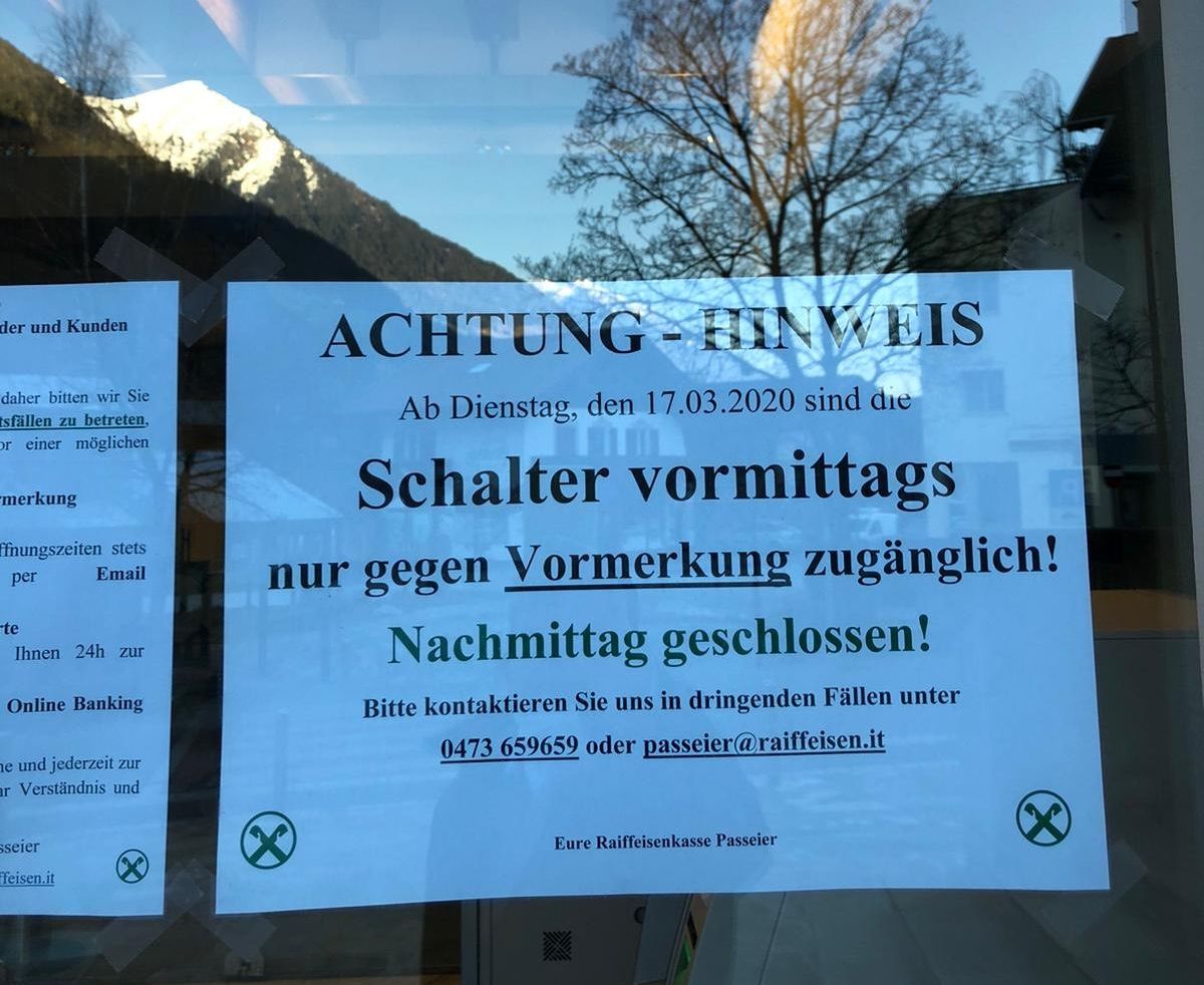Manfred Huber, Geschäftsführer der Raiffeisenkasse Salurn: „Derzeit können Kunden zwischen 8:00 und 12:30 Uhr zu uns kommen. Viele rufen vorher an, oder lösen ihr Anliegen komplett am Telefon. Wir stellen fest, dass die Frequenz inzwischen stark zurück gegangen ist“, sagt der Geschäftsführer. Die Zweigstellen Margreid und Laag sind am Montag, Mittwoch und Freitag vormittags ebenfalls offen. Auch kommen Kunden nur noch für dringende, bzw. nicht aufschiebbare Bankgeschäfte in die Raiffeisenkasse.