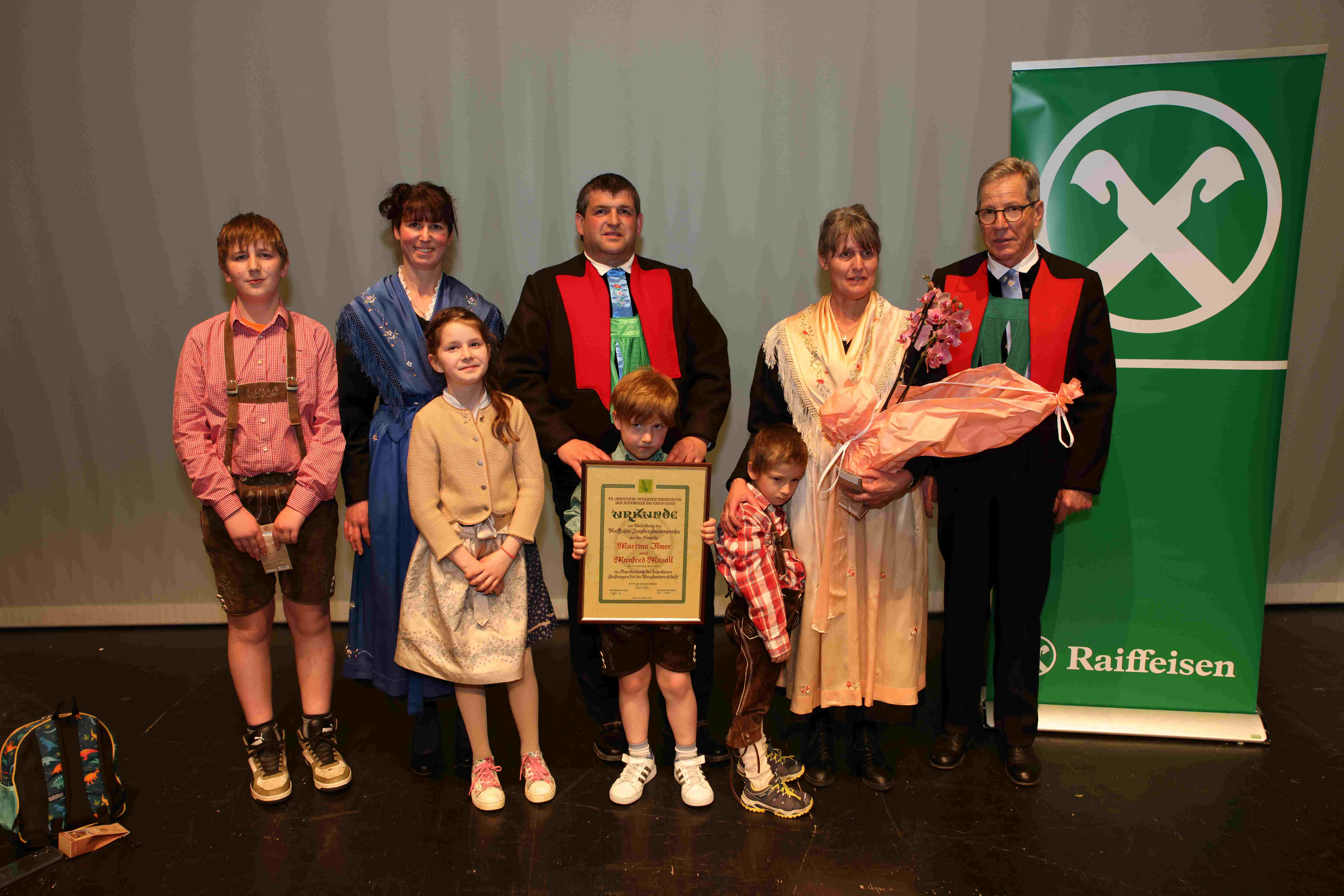 Auch in diesem Jahr wurde in Rahmen der Versammlung der Raiffeisen-Jungbergbauernpreis verliehen. Herbert Von Leon, Obmann des Raiffeisenverbandes, überreichte den mit 10.000 Euro dotierten Preis an die Familie Ilmer vom Monferthof in der Gemeinde Schnals. Der Preis wird nicht aufgrund der Bedürftigkeit einer Familie vergeben, sondern aufgrund ihrer Vorbildfunktion für den Bauernstand in Südtirol. Von Leon unterstreicht: „Es ist jedes Mal beeindruckend zu sehen, unter welchen schwierigen Bedingungen und doch mit wie viel Freude und Zuversicht junge Menschen ihren Hof bewirtschaften.“